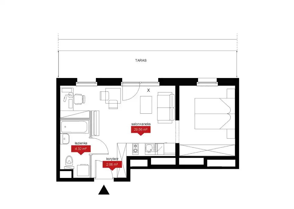 Mieszkanie o powierzchni około 36m2 składa się z: