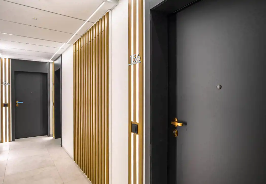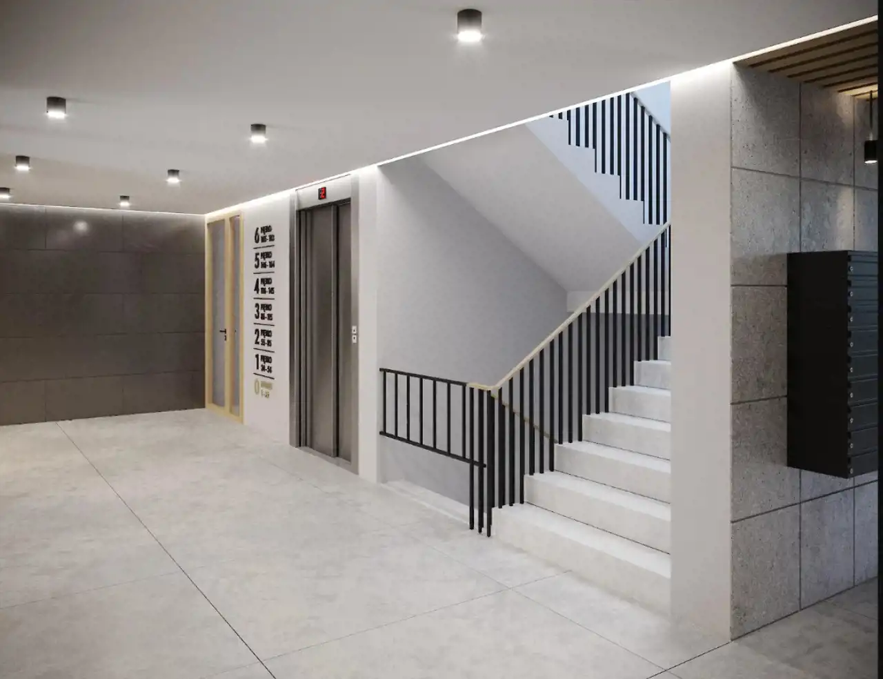 Wnętrza: system smart home, drewniana stolarka okienna, grzejniki kanałowe oraz wyprowadzenie pod klimatyzację na 5. i 6. piętrze, rolety elektryczne na parterze