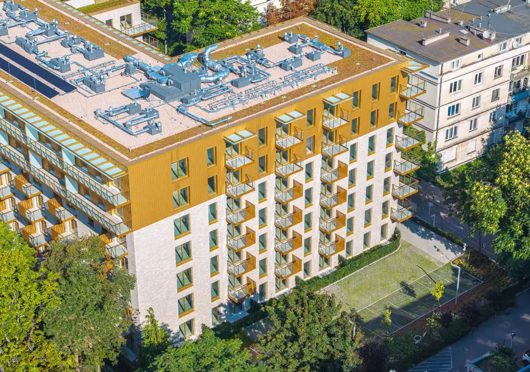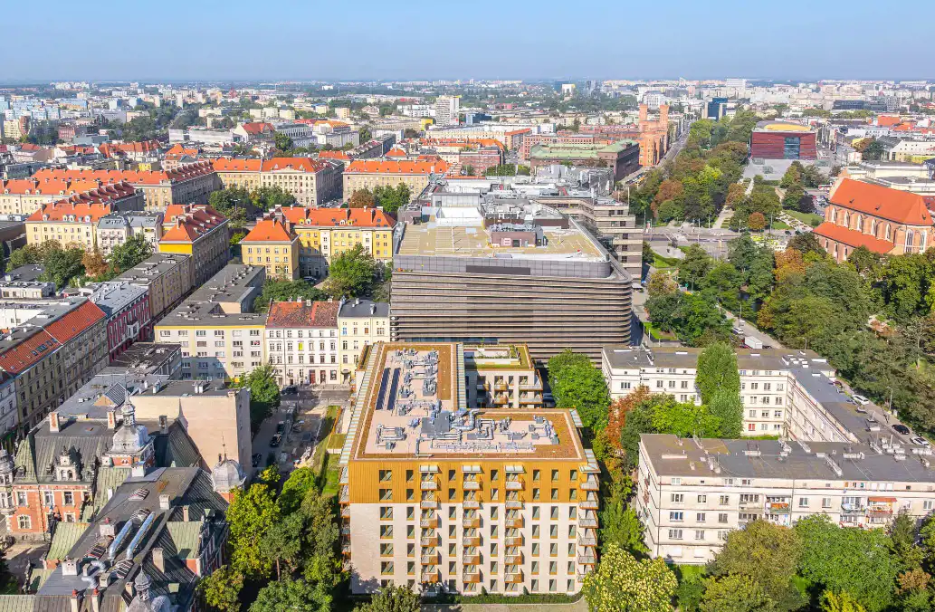 W inwestycji zastosowano szereg udogodnień ekologicznych tj. panele fotowoltaiczne, system nawadniania roślinności opartego o wykorzystanie wody opadowej, domki dla ptaków oraz zielone dachy i duża ilość miejsc rowerowych.