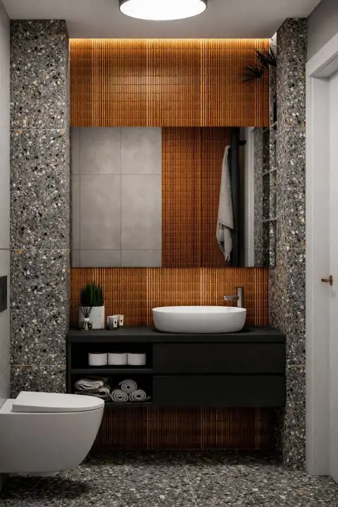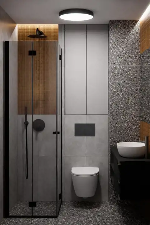 Nowoczesna z prysznicem typu walk-in, czarnymi akcentami armatury i praktyczną zabudową.