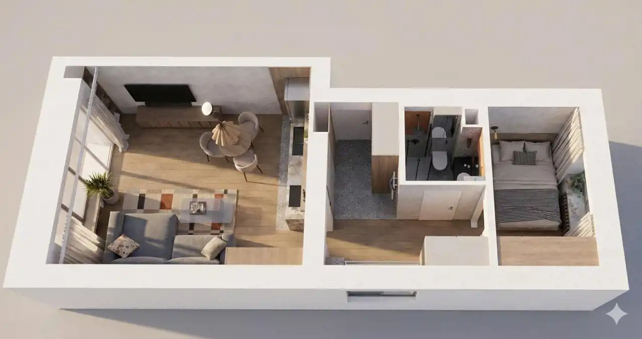 Przedstawione wizualizacje przedstawiają mieszkanie po remoncie razem z meblami i sprzętami AGD które są wliczone w cenę!