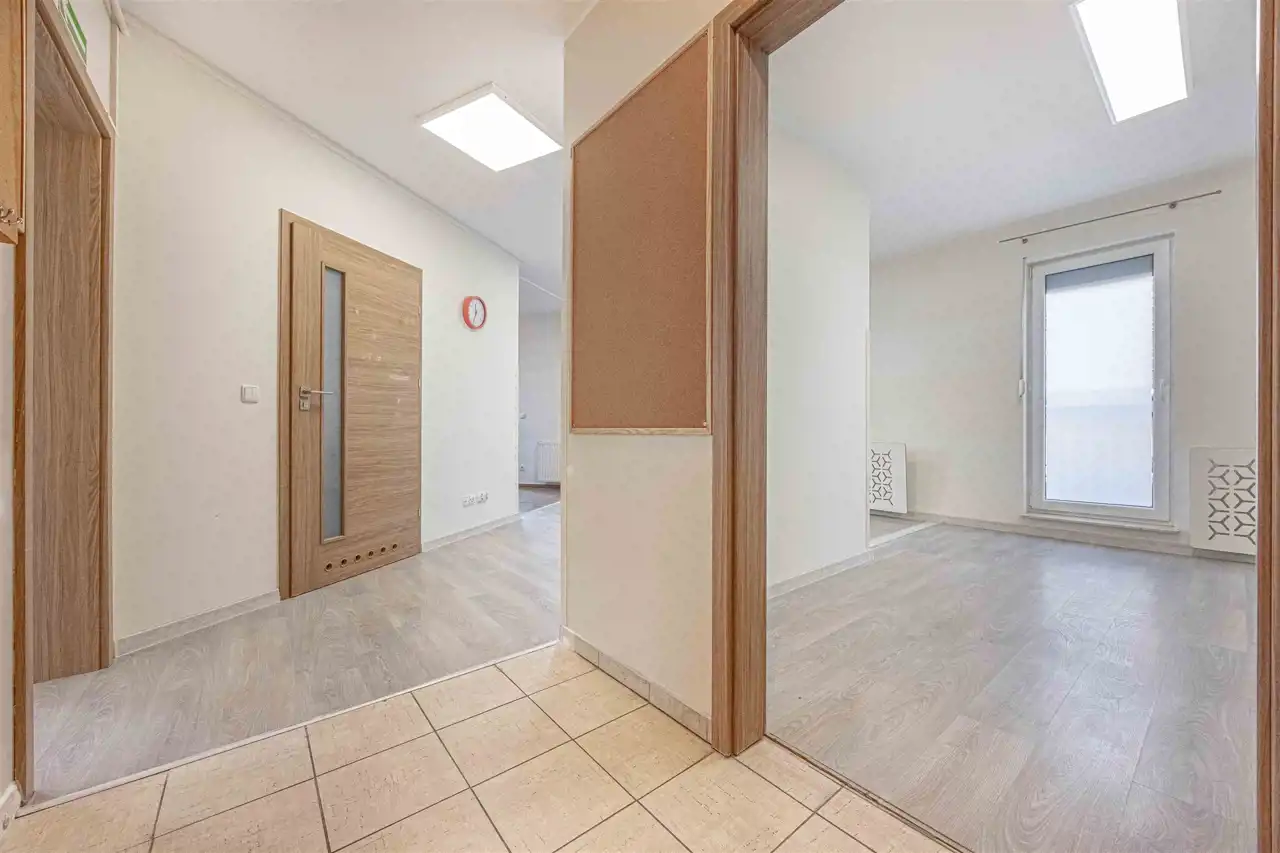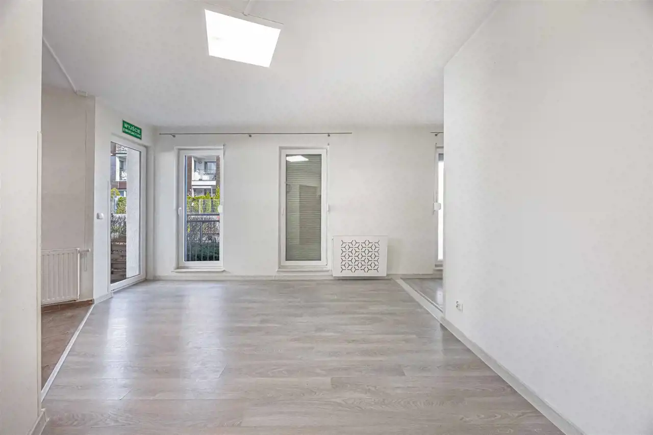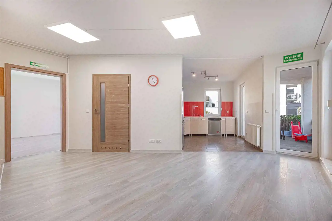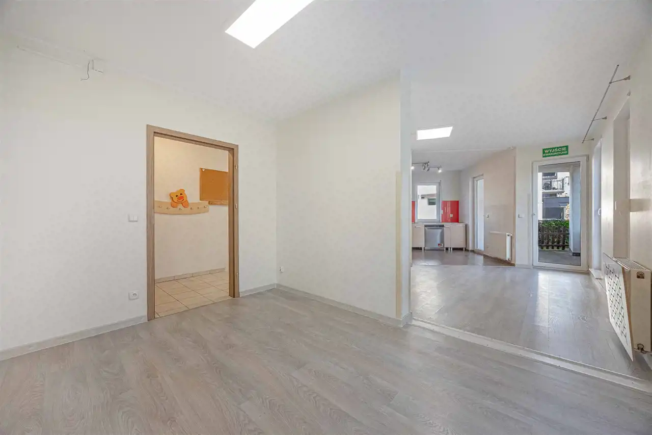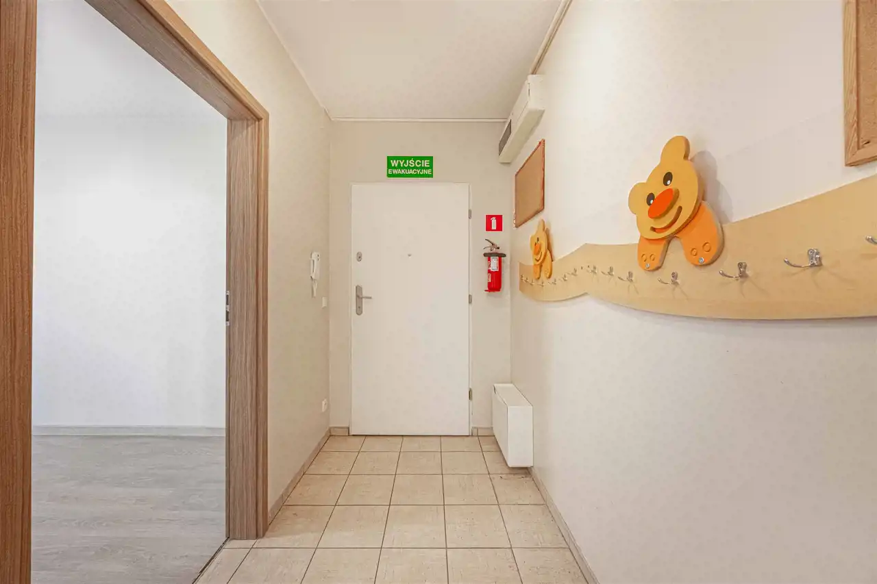 Mieszkanie przez kilkanaście lat było siedzibą żłobka, z tego względu wyposażenie lokalu nie jest pełne a jego układ został delikatnie zmieniony. Wycena nieruchomości brała pod uwagę konieczne do przeprowadzenia prace adaptacyjne związane z dostosowaniem lokalu do tego aby spełniał funkcję mieszkalną. Stan lokalu i cena pozwalają na adaptację i wykończenie mieszkania według własnego pomysłu i gustu.