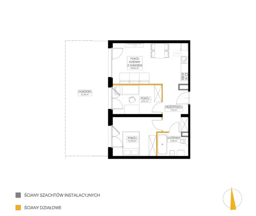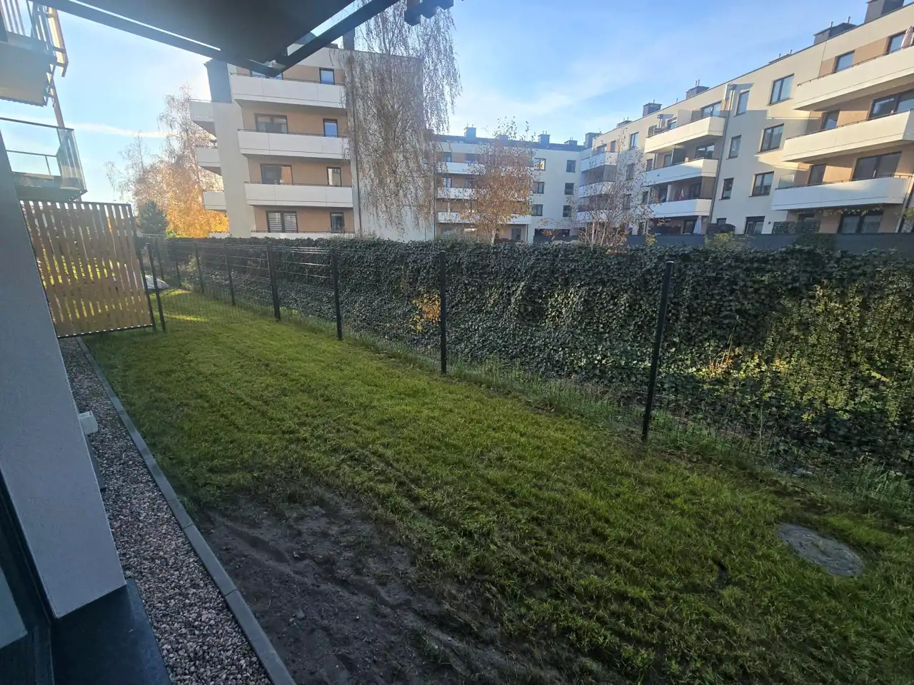 Mieszkanie składa się z przestronnego salonu z aneksem kuchennym, 2 sypialni, ustawnego przedpokoju, łazienki oraz dodatkowo ogródka o powierzchni 32m2.