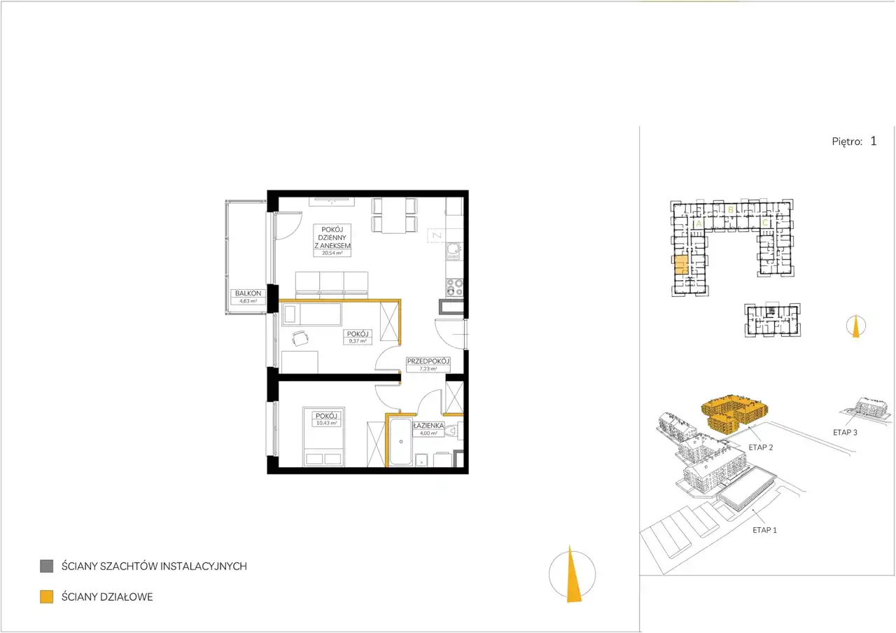 Funkcjonalne,narożne mieszkanie 3-pokojowe o powierzchni 52 m2 usytuowane na pierwszym piętrze kameralnego budynku wielorodzinnego.