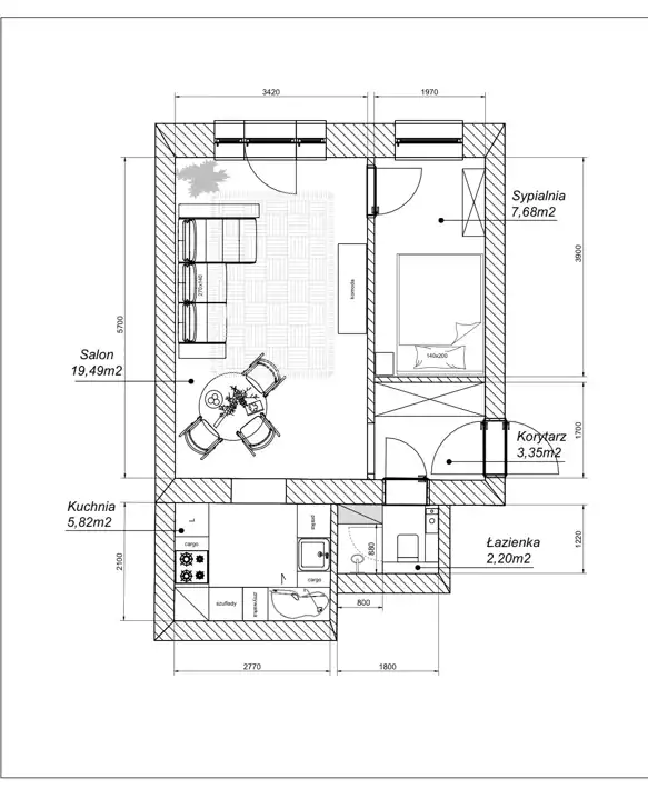 Przemyślany projekt wnętrza podzielił przestrzeń na strefy, które optycznie powiększają metraż: