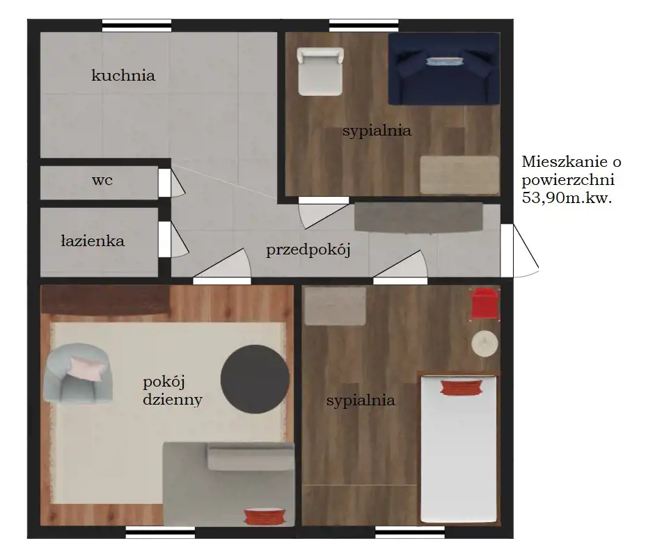 - Charakterystyka mieszkania 53.9 m2, 3 pokoje