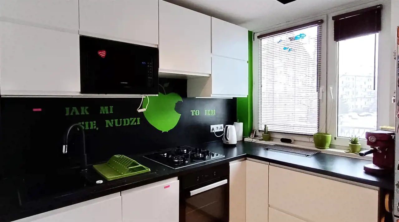 Kuchnia wykończona glazurą i terakotą wyposażona w meble i sprawny sprzęt agd. W łazience kabina prysznicowa, umywalka i szafki łazienkowe. W przedpokoju znajduje się duża szafa z lustrem, która powiększa wizualnie pomieszczenie. Mieszkanie nadaje się do natychmiastowego zamieszkania. Właścicielka chętnie pozostawi wyposażenie kuchni (meble, sprzęt agd), część wyposażenia sypialni (szafy, łóżka, biurka, szafki) a w przedpokoju dużą szafę. Drzwi i futryny w dobrym stanie i nie wymagające wymiany. Mieszkanie dobrze nasłonecznione i ciepłe. Na kaloryferach podzielniki ciepła.