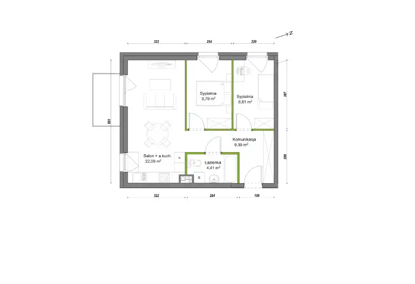 - Charakterystyka mieszkania 54.51 m2, 3 pokoje