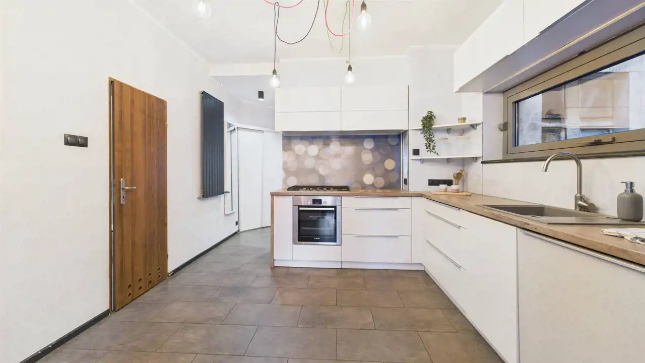 - Kuchnia – 15,45 m²: wyremontowana w 2017 roku (wymiana instalacji elektrycznej na miedzianą).