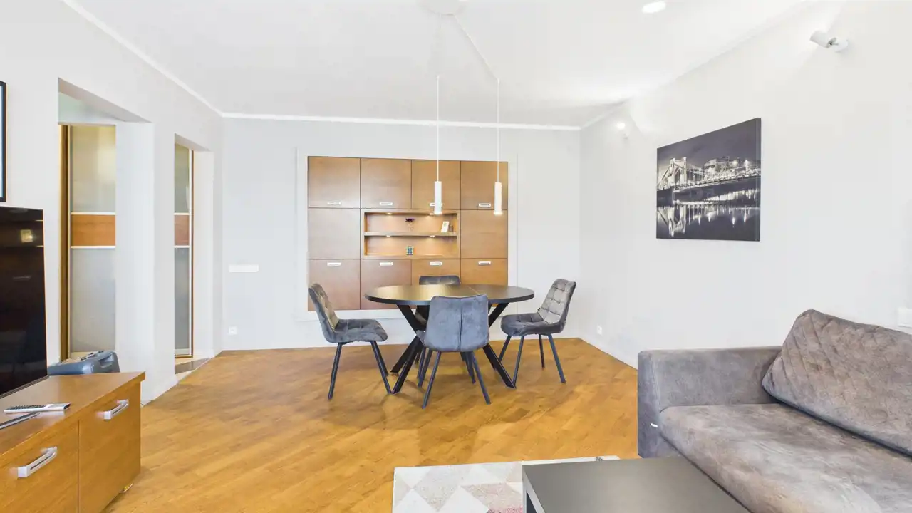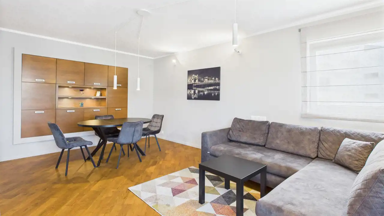 Salon – jasny, z wyjściem na balkon, wyposażony w rozkładany narożnik, stół z krzesłami, stolik RTV, telewizor Sony oraz meble wykonane pod wymiar. Na podłodze elegancki parkiet dębowy.