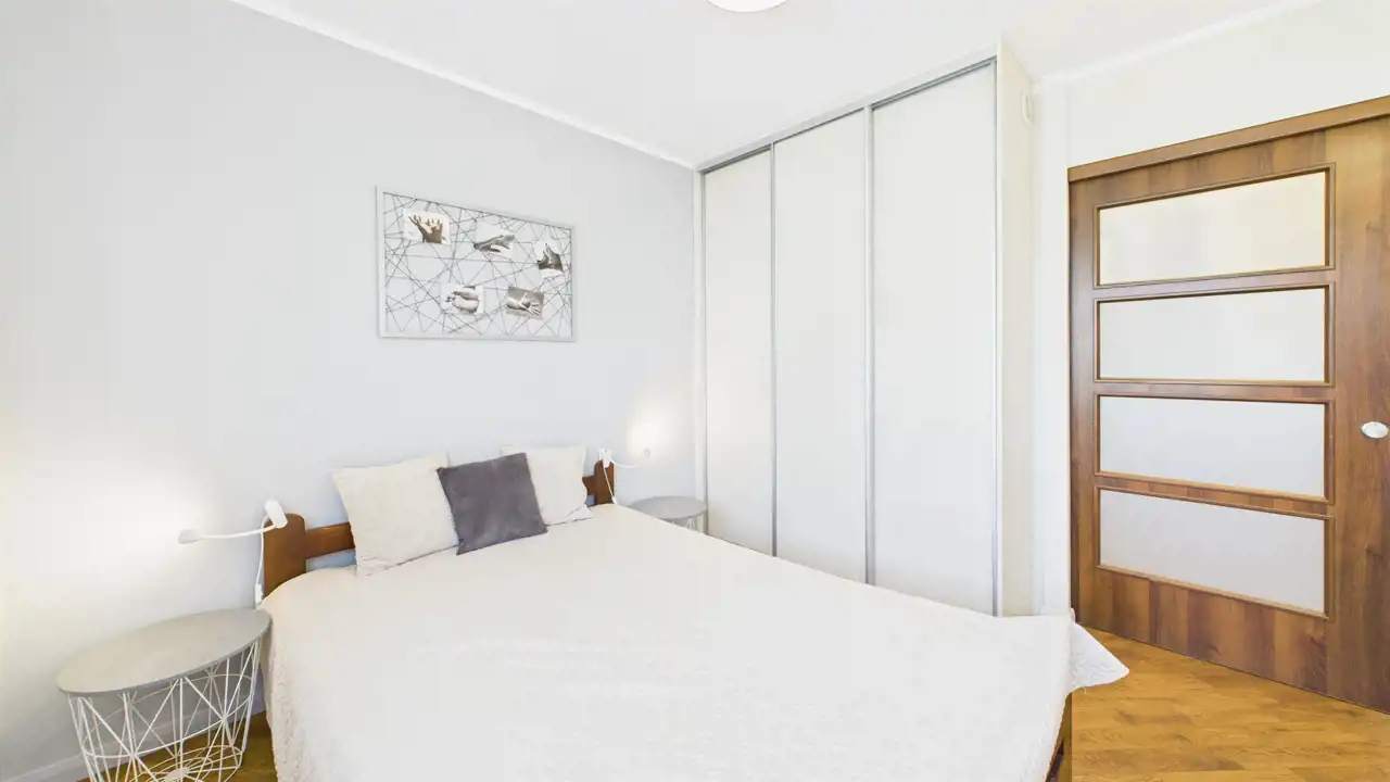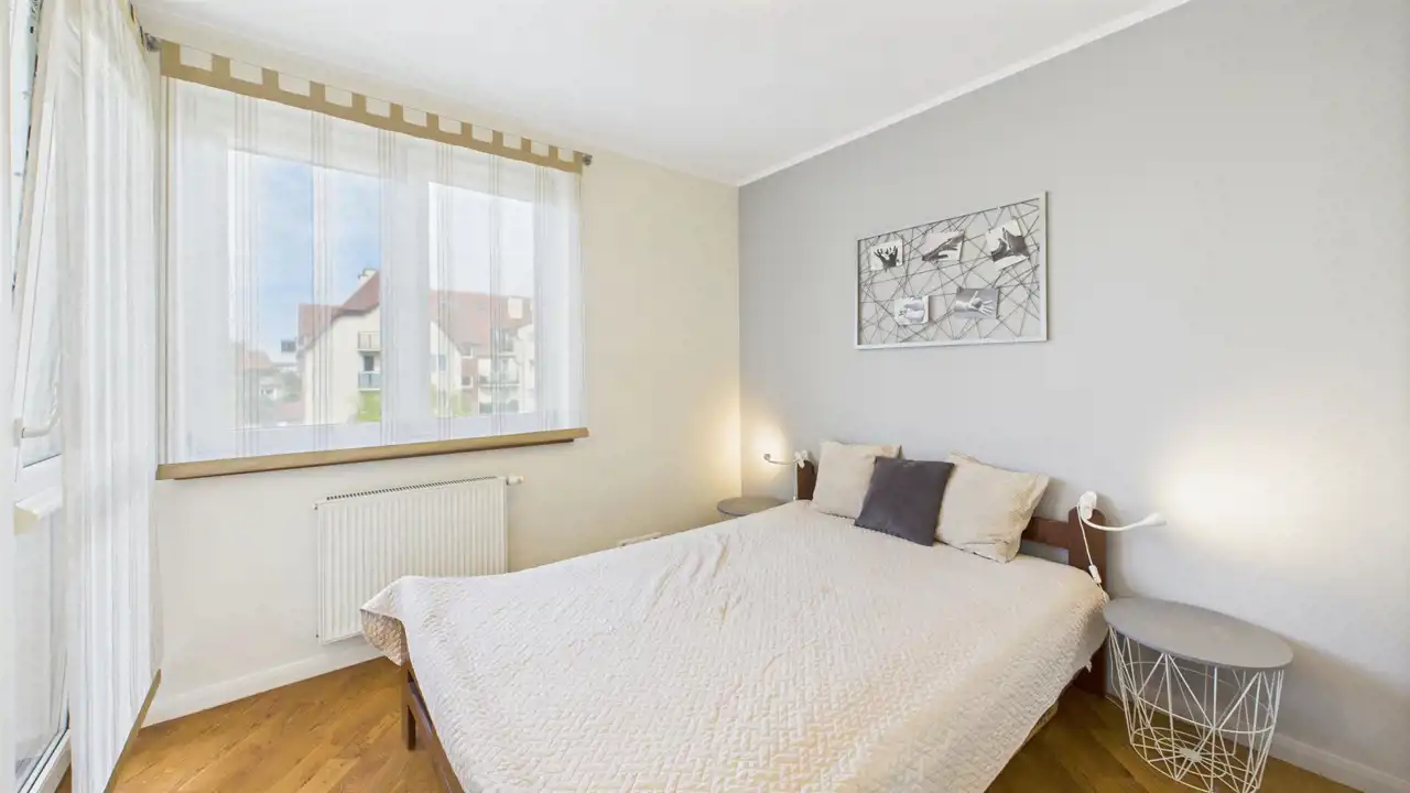 Sypialnia – duże łóżko z materacem, pojemna szafa z drzwiami przesuwnymi, stoliki i lampki nocne. Sypialnia może być przeznaczona na pokój dziecięcy (w cenie meble firmy Meblik - łóżko piętrowe, biurko oraz szafki pod łóżko). Parkiet dębowy dodaje wnętrzu ciepła.