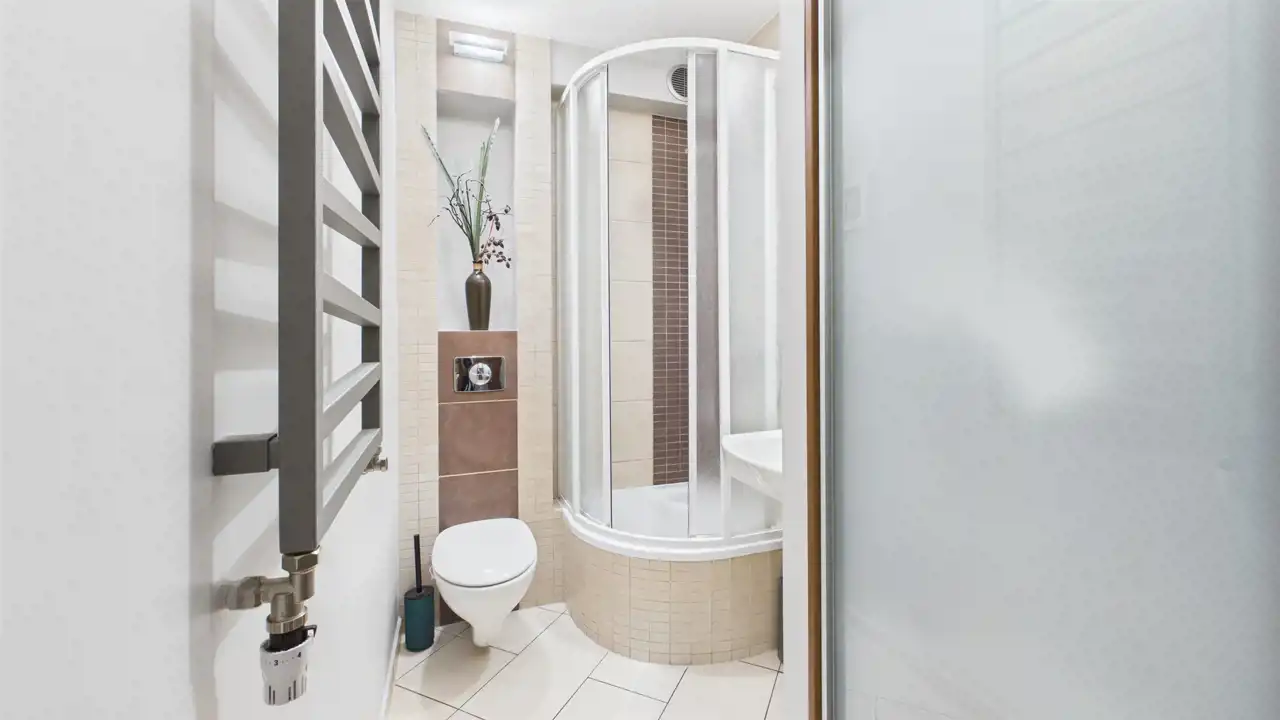 Łazienka – kabina prysznicowa, pralka Whirpool, umywalka, WC.