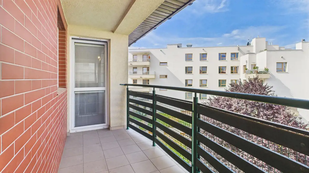 Zarówno z salonu, jak i sypialni można wyjść na balkon z widokiem na zieleń.
