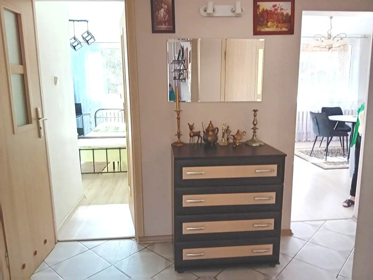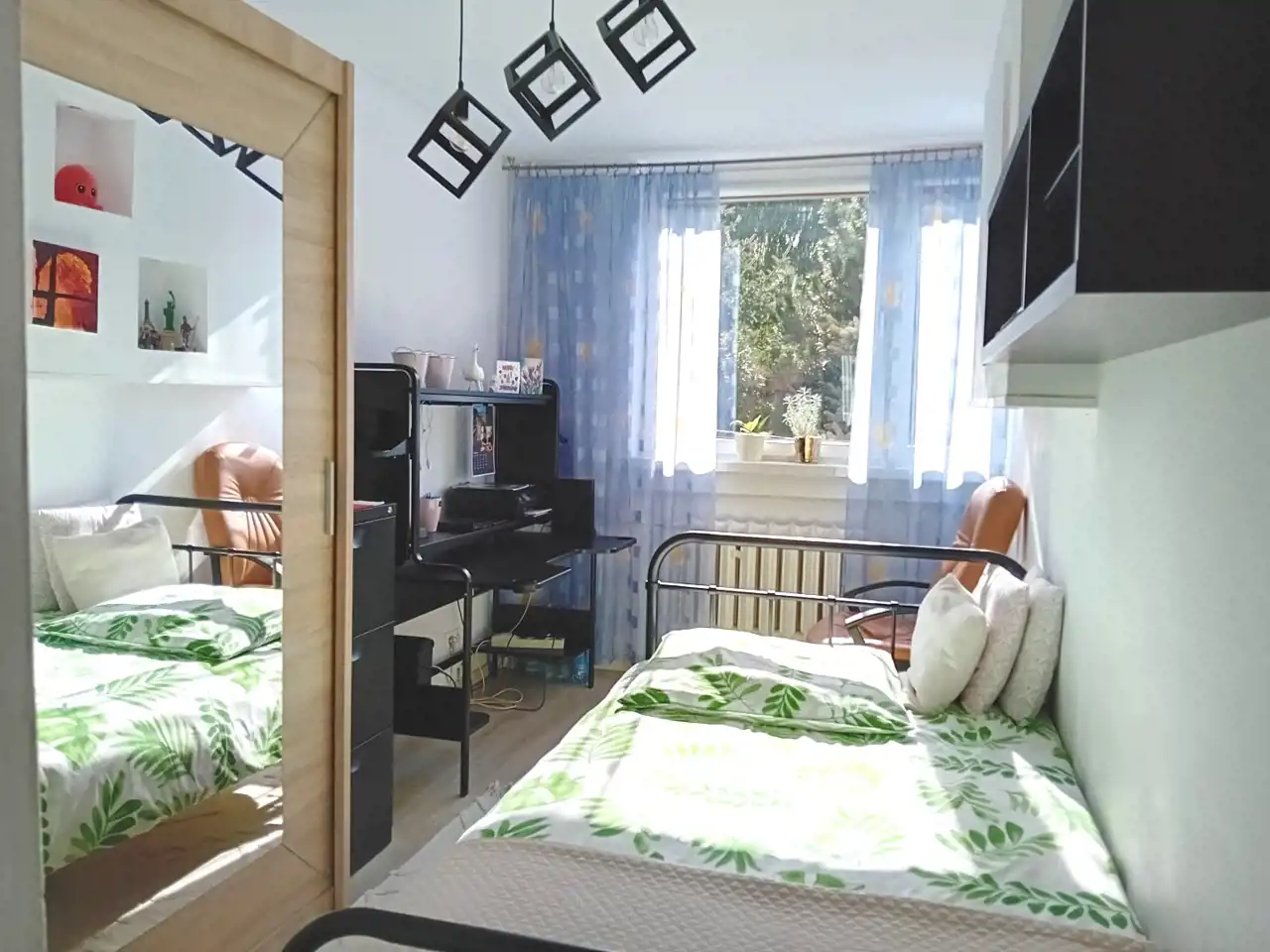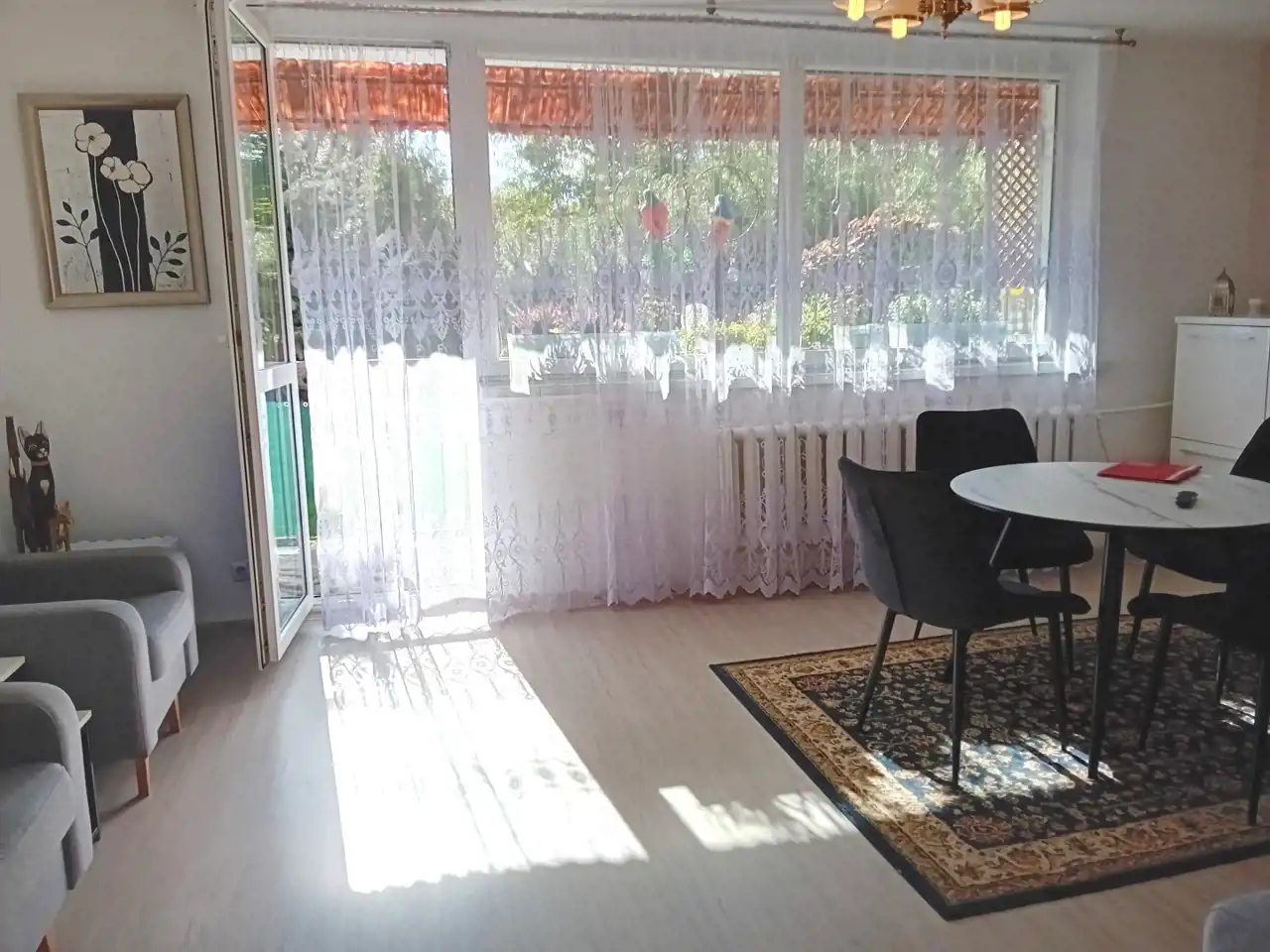 Mieszkanie w zachodniej części Wrocławia , w pobliżu Las Mokrzański i Leśnicki, bardzo spokojna i cicha okolica . Mieszkanie na parterze budynku 2 piętrowego. Tylko 6 mieszkań w klatce. Mieszkanie dwustronne północ- południe , duży balkon z widokiem na zieleń. Okna PCV , podłogi panele i kafle , na ścianach gładzie . Grzejniki żeliwne