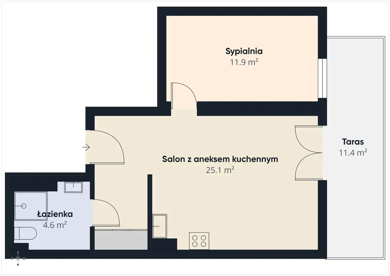 - salon z aneksem kuchennym i wyjściem na duży taras 12 m².