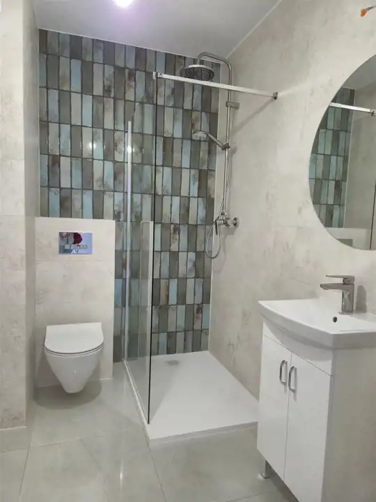 -- łazienka 4,5 m2, kompaktowa, pięknie wykończona z kabiną prysznicową,
