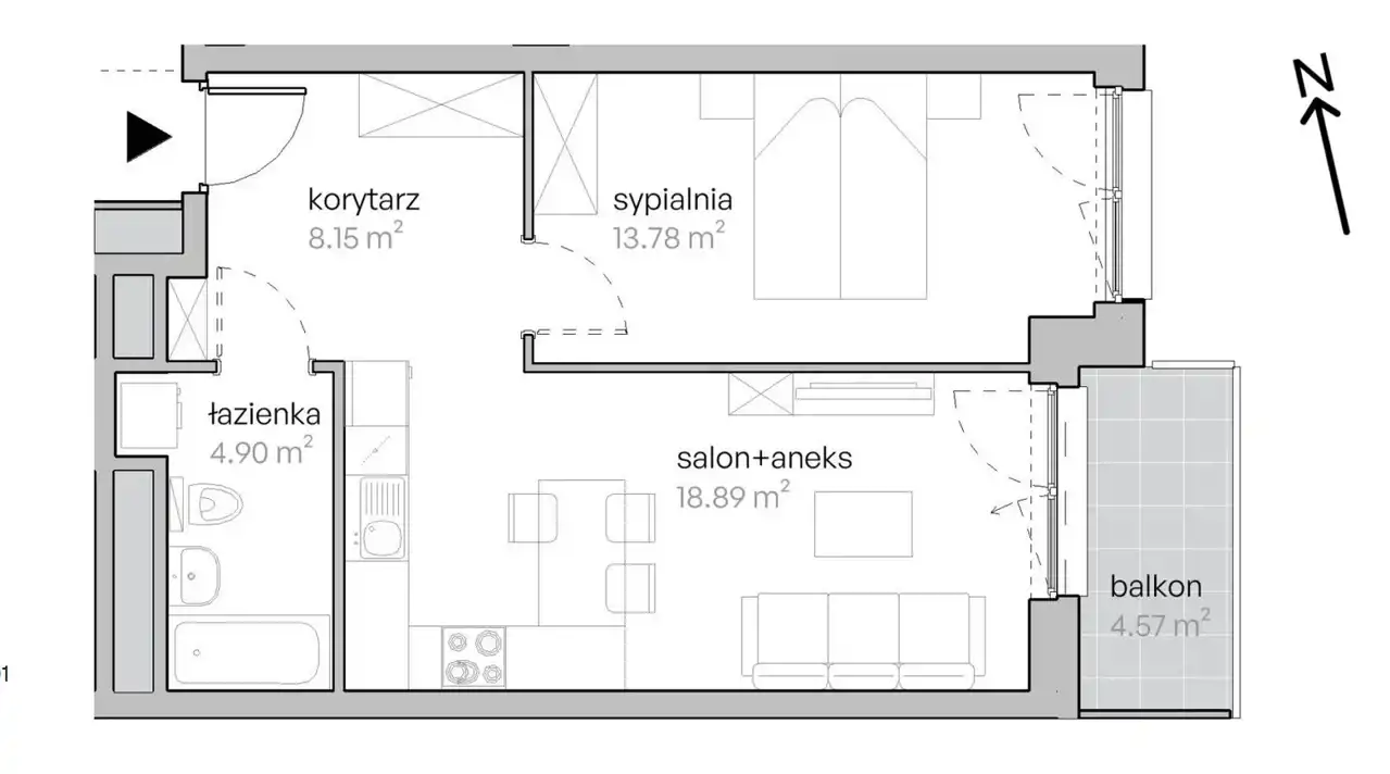 Mieszkanie ma funkcjonalny, wygodny układ. Strefa dzienna z aneksem kuchennym jest dobrze doświetlona dzięki dużym przeszkleniom i posiada wyjście na balkon. Sypialnia jest ustawna, z miejscem na pojemną zabudowę. Łazienka oferuje miejsce na wannę lub możliwość zmiany na prysznic według preferencji. Przestronny korytarz pozwala na aranżację szafy wnękowej.