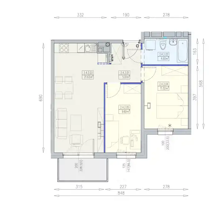 Mieszkanie składa się z salonu z aneksem kuchennym,dwóch sypialni, łazienki,ustawnego przedpokoju oraz dodatkowo balkonu.