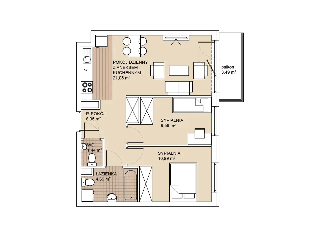 - Charakterystyka mieszkania 53.8 m2, 3 pokoje