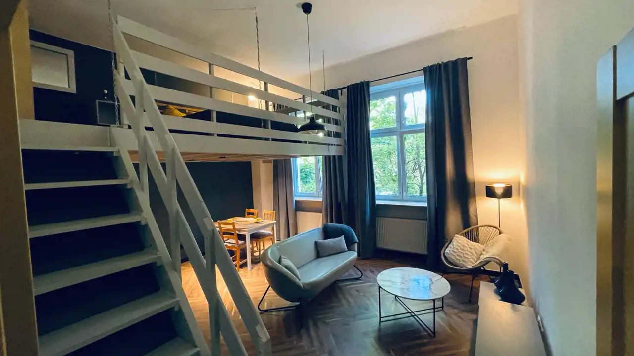 Mieszkanie o pow. 46 m2 + antresola 12 m2, usytuowane na I piętrze kamienicy, okna od podwórza z zielenią, przez to cisza i spokój w centrum miasta.
