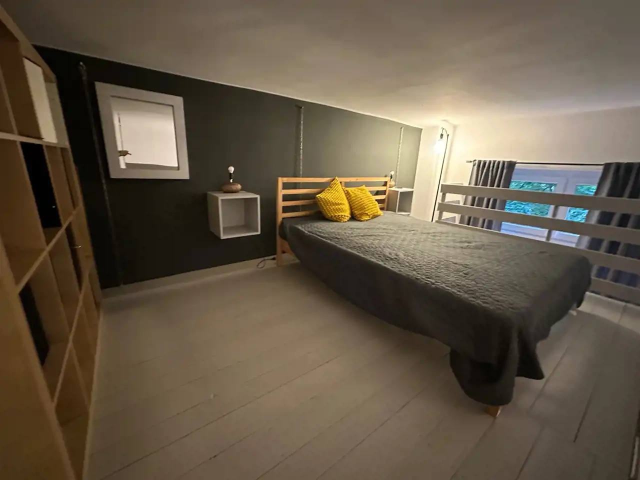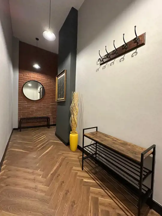Skład mieszkania: duży pokój z aneksem kuchennym i antresolą, łazienka, pokój przechodni i hol.