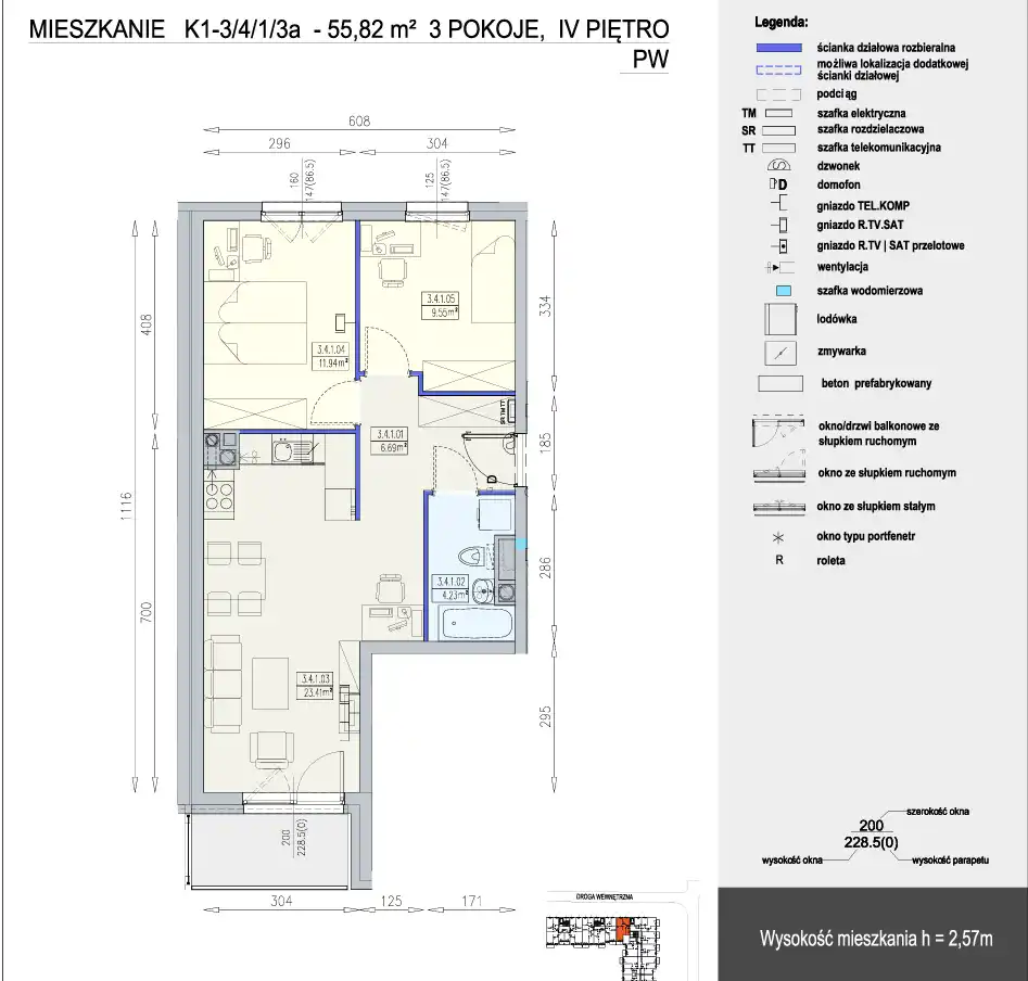 - Charakterystyka mieszkania 55.82 m2, 3 pokoje
