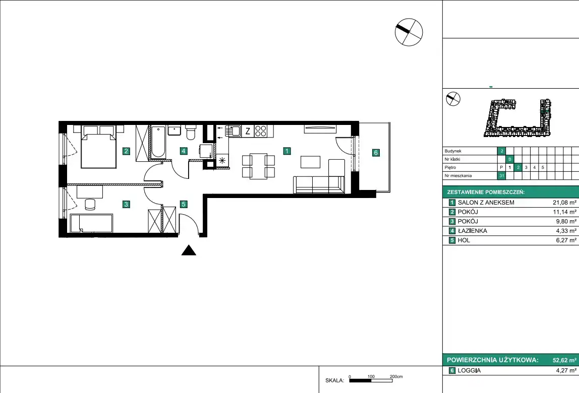 - Charakterystyka mieszkania 52.62 m2, 3 pokoje