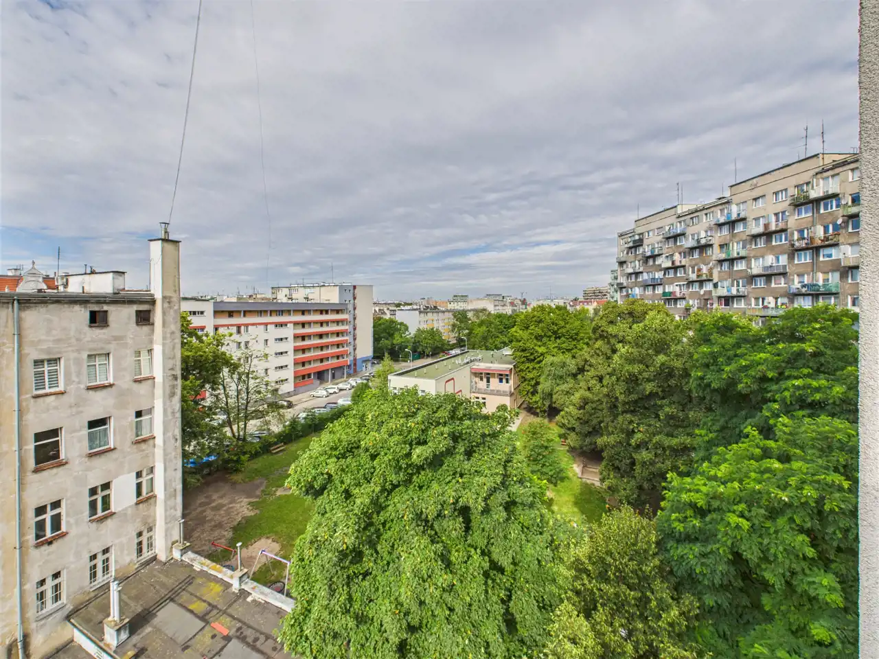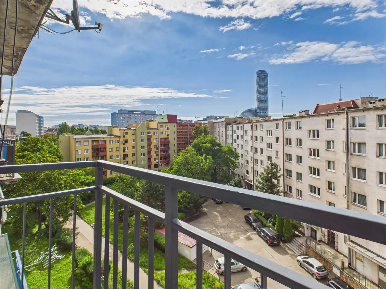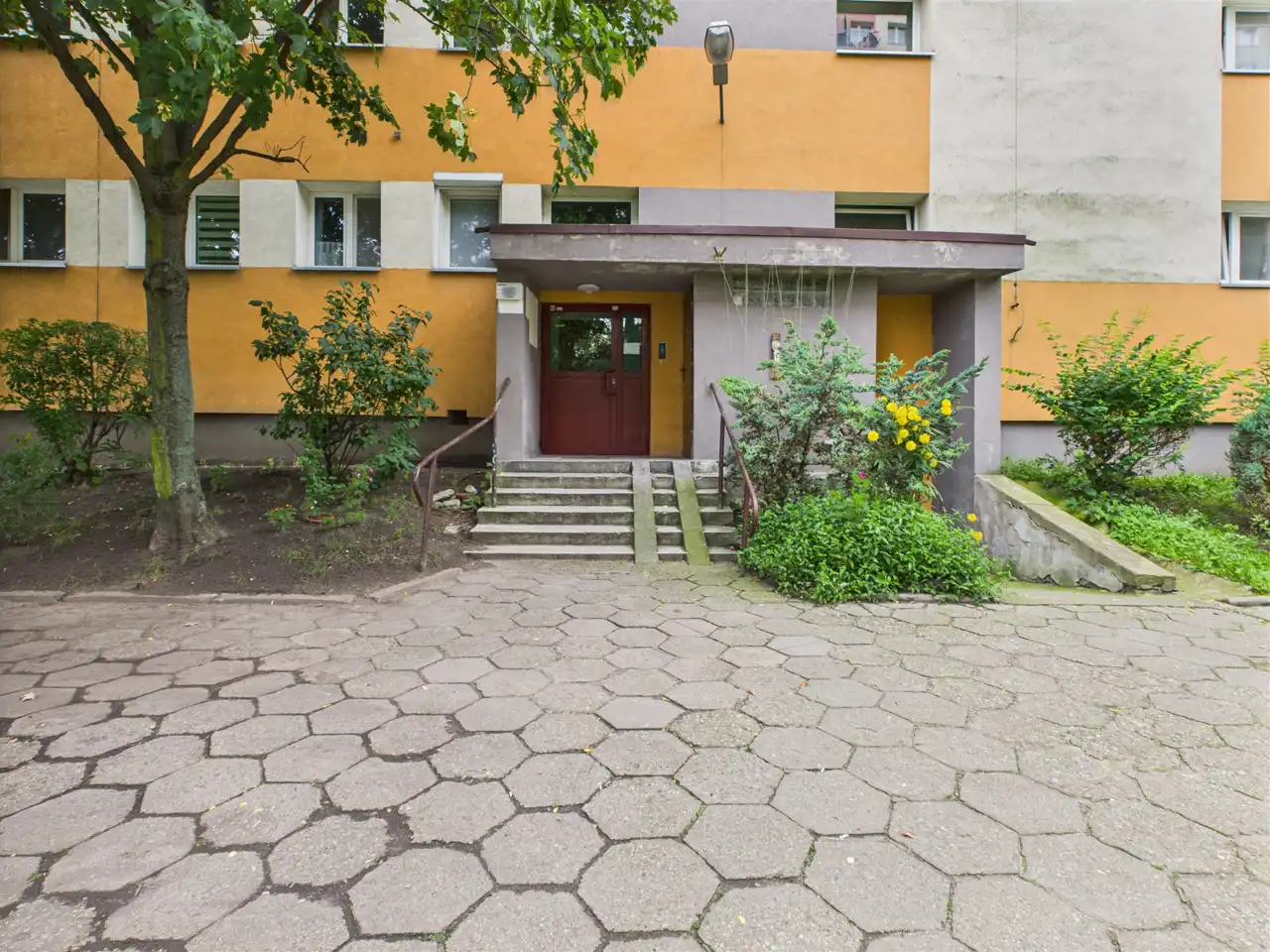 Mieszkanie znajduje się na 5 piętrze z 10 w budynku z windą z 1971r. Budynek jest po remoncie elewacji, a części wspólne są odnowione. Przed budynkiem znajduje się ogólnodostępny parking