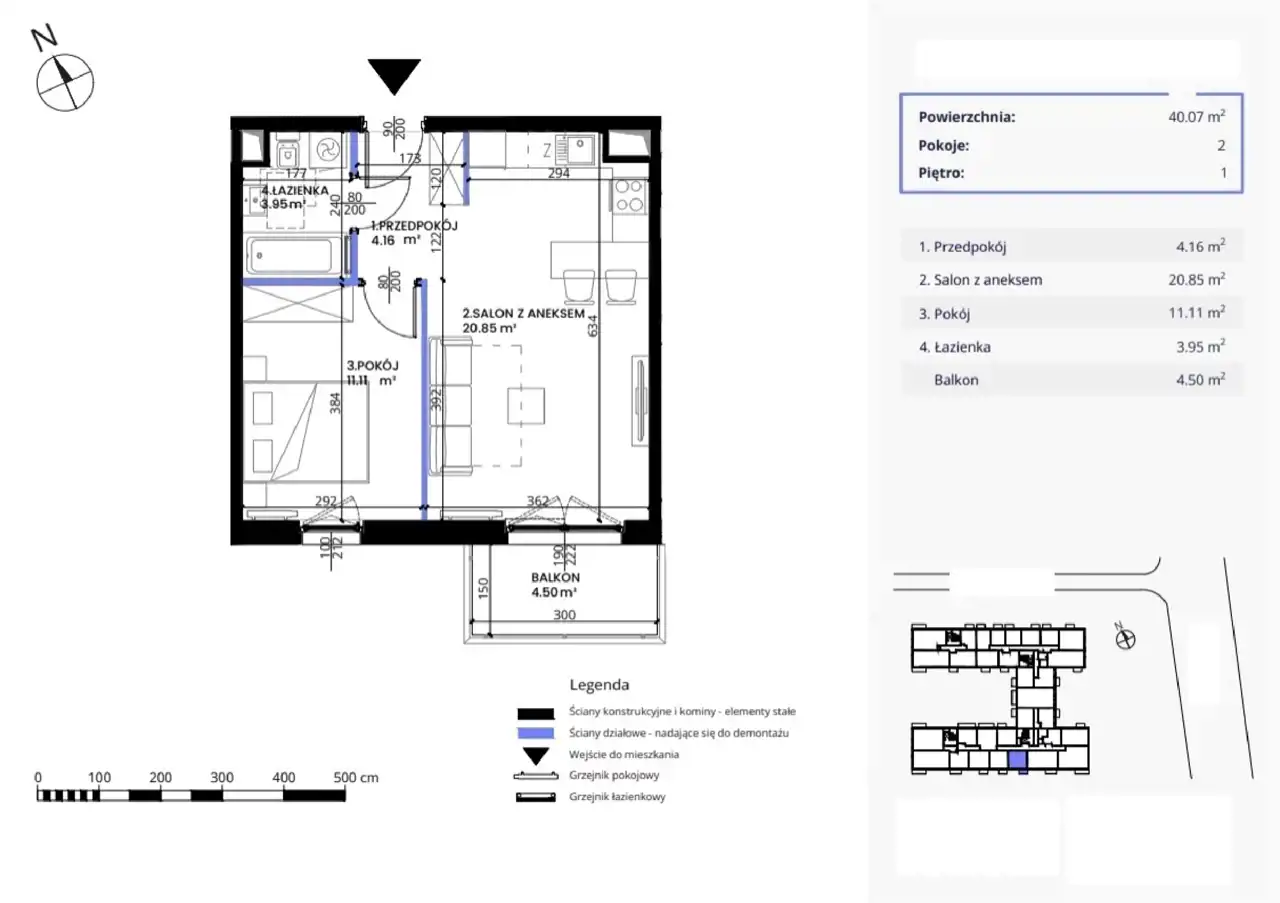 - Charakterystyka mieszkania 40.07 m2, 2 pokoje
