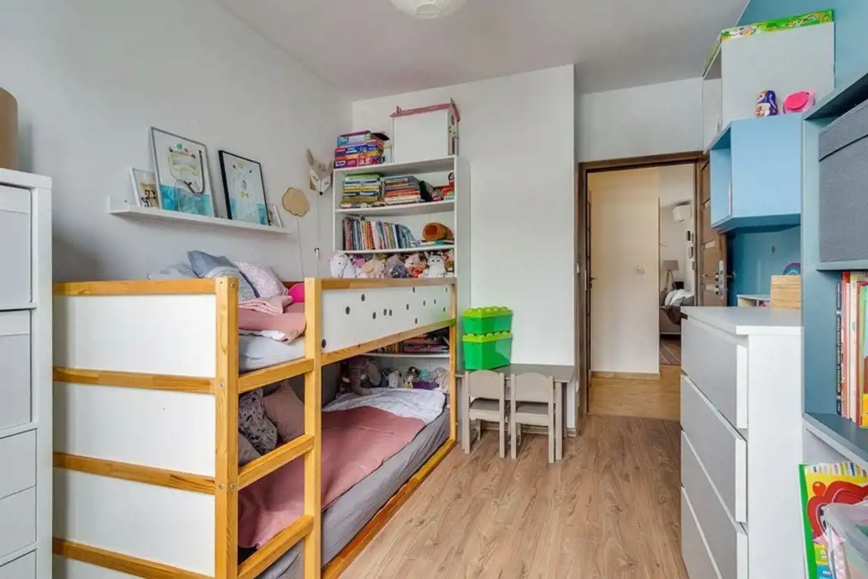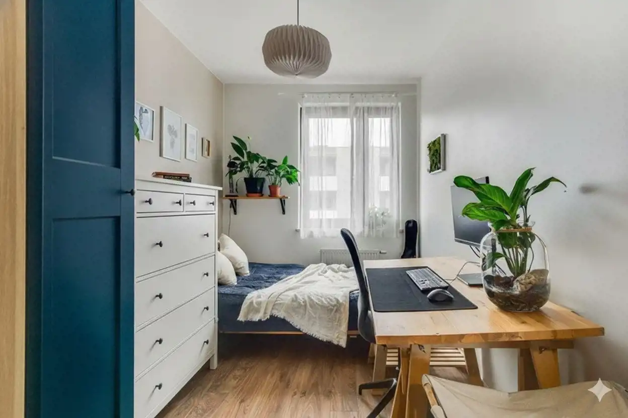 Dwie Niezależne Sypialnie (SY 11,04 m² i SY 10,40 m²) zapewniają prywatność i łatwość aranżacji (widoczne na zdjęciach, jako pokój dziecięcy i gabinet/sypialnia).