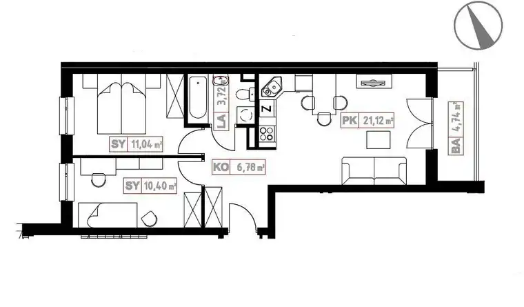 Strefa Dzienna (PK) to przestronny, jasny salon z funkcjonalnym aneksem kuchennym (KO 6,78 m²) i bezpośrednim wyjściem na balkon (BA 4,74 m²), idealny do wypoczynku i spotkań towarzyskich.