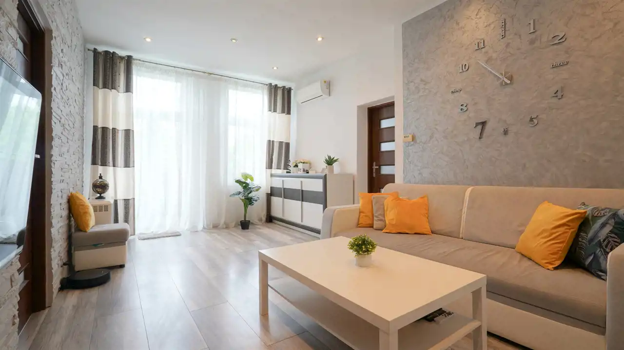 Podłogi pokryte są panelami oraz kaflami które są dobrze utrzymane. Do Garderoby można mieć dostęp od strony przedpokoju a także sypialni (wystarczy wstawić drzwi) W salonie została zainstalowana klimatyzacja.