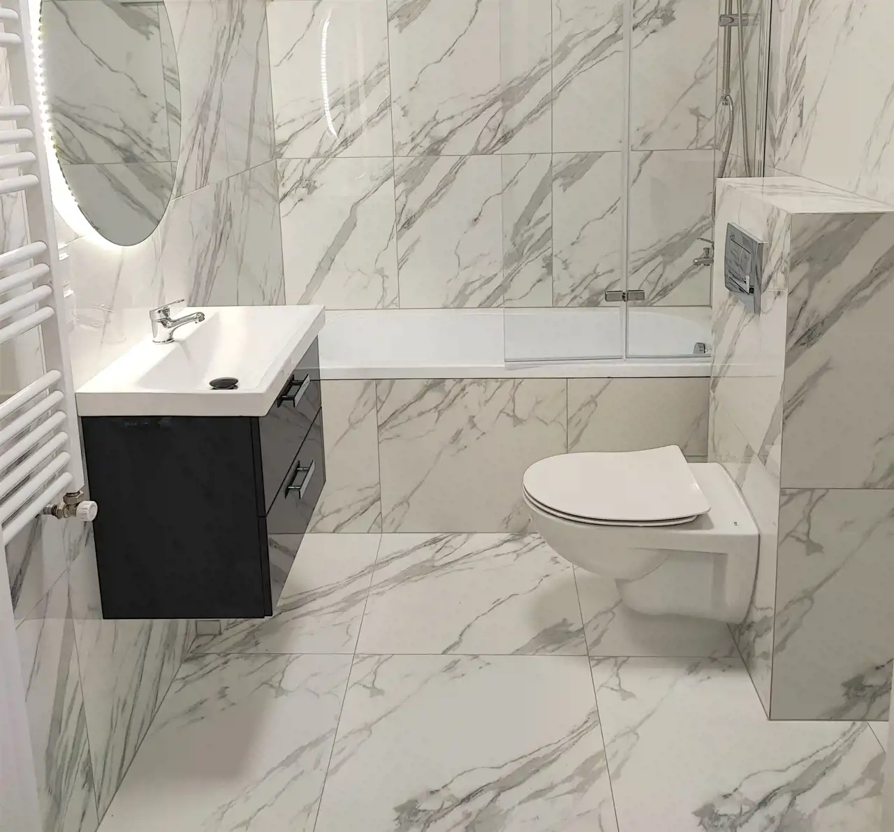 Dwie sypialnie (13,73 m² i 11,56 m²) ustawne, z miejscem na szafy i biurka. Łazienka z wanną wyposażoną w boczną szybę i deszczownicę, podwieszana muszla z klapą wolnoopadającą, umywalka z podwieszaną szafką z szufladami. Przedpokój z dużymi jasnymi kaflami, które płynnie przechodzą w część kuchenną, spójna komunikacja i elegancja.