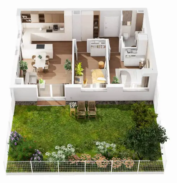 Mieszkanie składa się z przestronnego salonu z aneksem kuchennym , 2 sypialni, ustawnego przedpokoju, łazienki, oraz dodatkowo ogródka(59 m2)