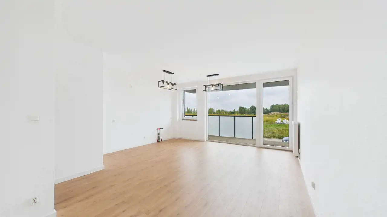 - przestronny salon z aneksem kuchennym i dużymi oknami, które wpuszczają mnóstwo światła,