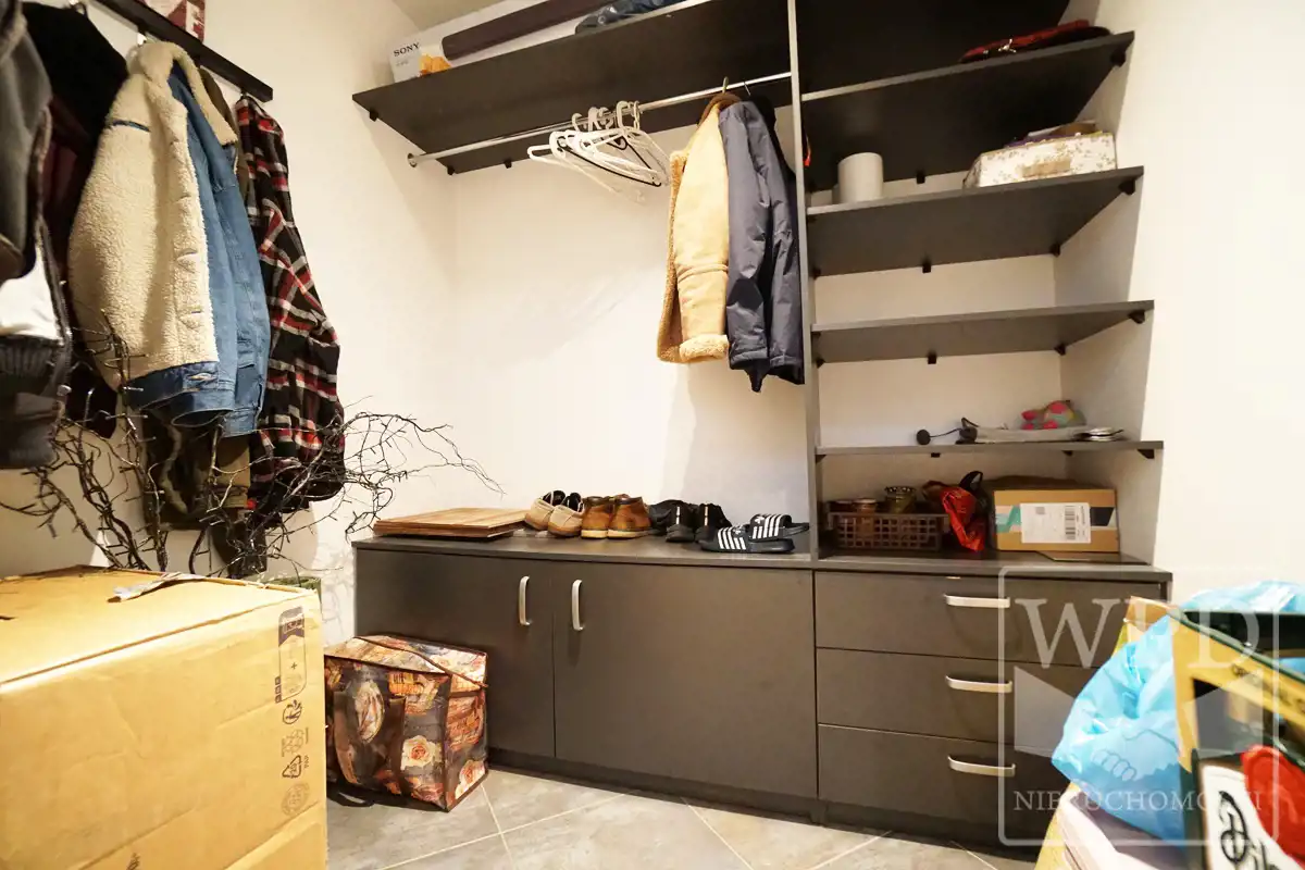 Salon z aneksem kuchennym, sypialnia, łazienka z kabiną prysznicową, garderoba pełna schowków i miejsc do wieszania odzieży.