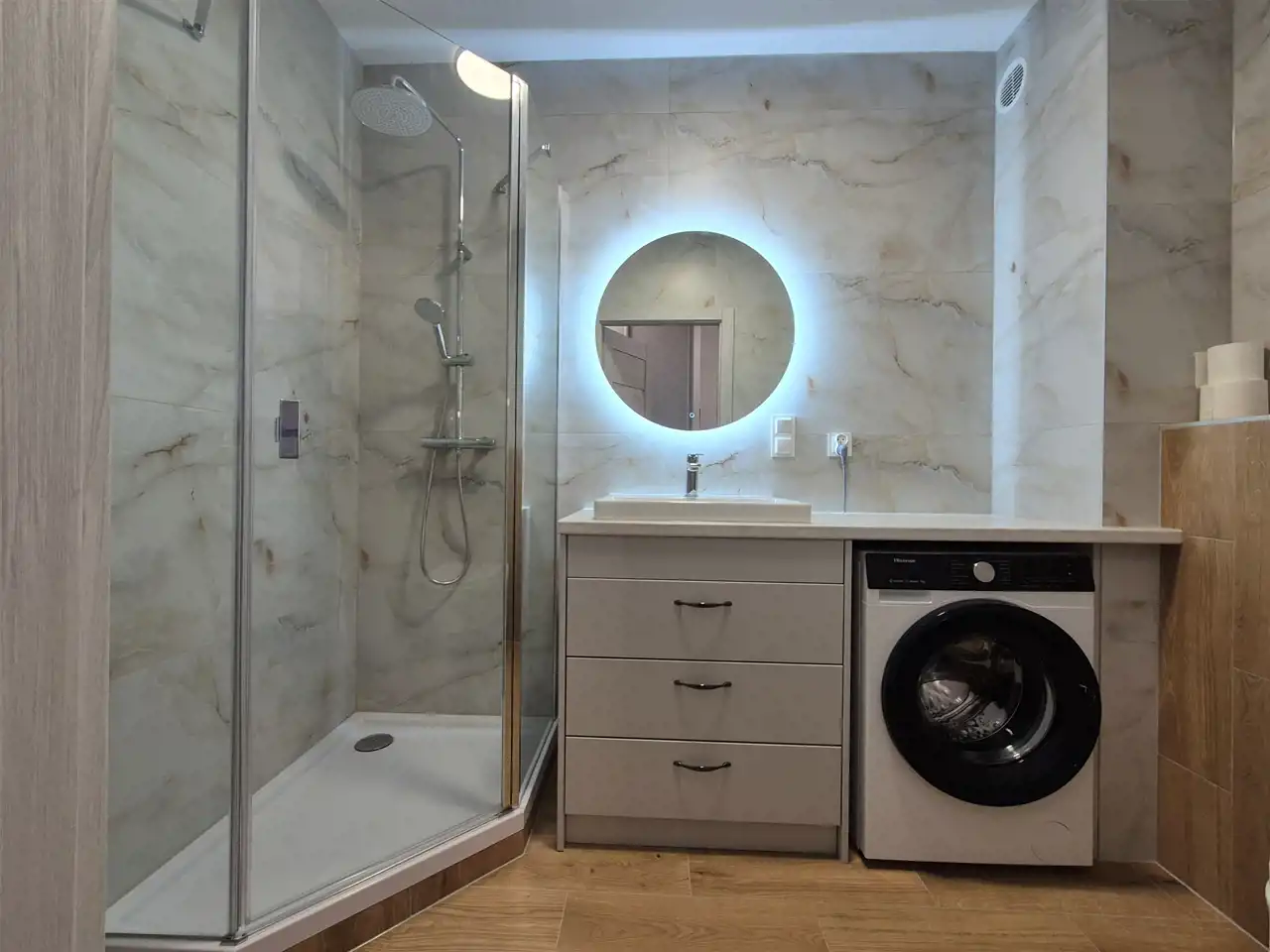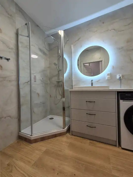 Na podłodze w zależności od pomieszczeń kafle i panele dobrej klasy.
