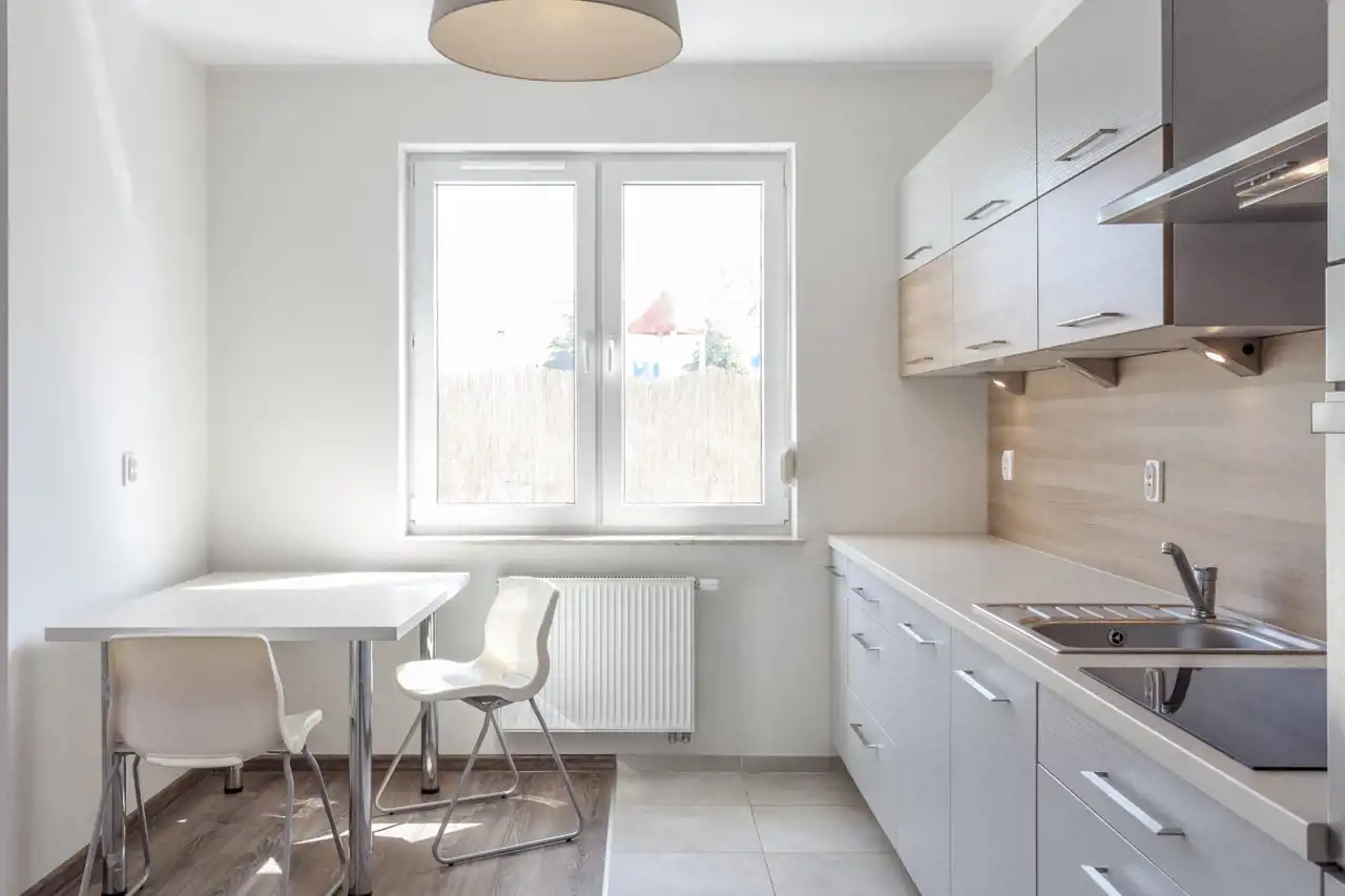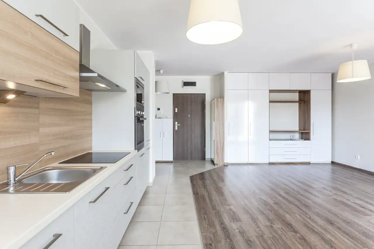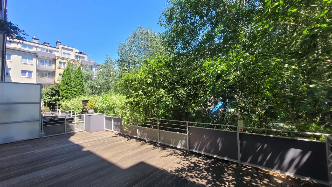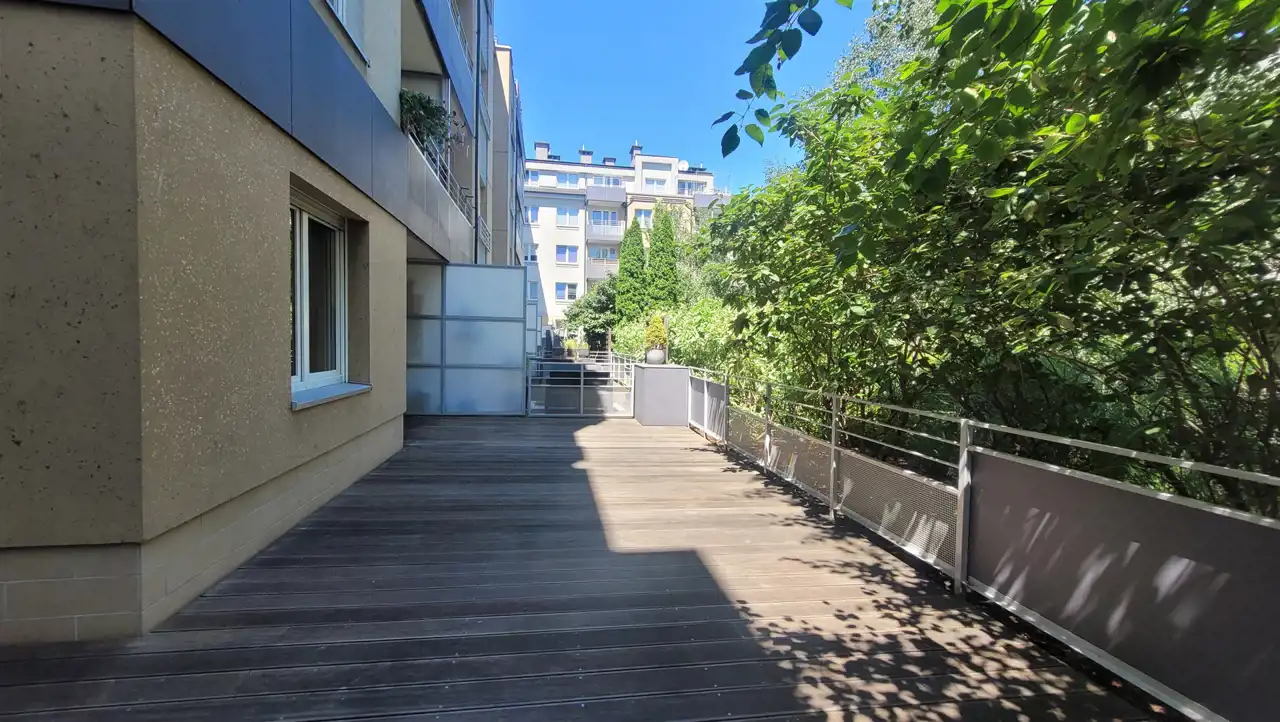 Mieszkanie jest w pełni umeblowane, czyste i zadbane, wykończone w wysokim standardzie. Przestrzeń jest wypełniona naturalnym światłem dziennym, co potęguje poczucie świeżości i komfortu. Układ lokalu obejmuje salon z aneksem kuchennym, sypialnię, łazienkę z toaletą, przedpokój oraz wyjątkowy atut – taras o powierzchni około 30 m² z bezpośrednim widokiem na gęstą zieleń i wysokie drzewa, który gwarantuje prywatność oraz idealne warunki do odpoczynku na świeżym powietrzu.