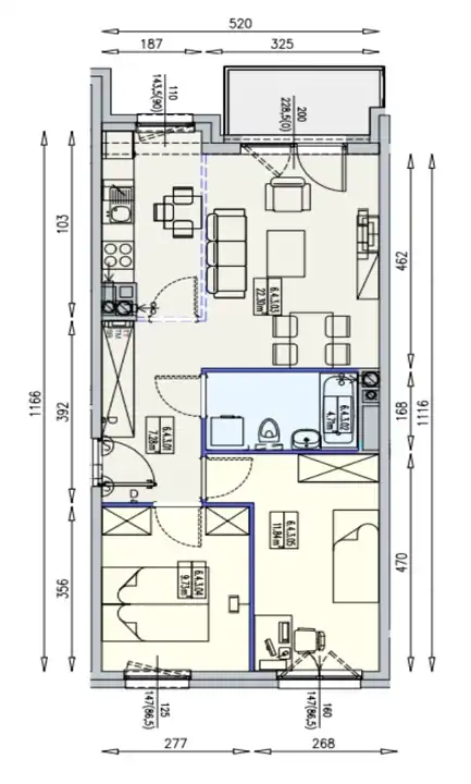 - Charakterystyka mieszkania 55.9 m2, 2 pokoje