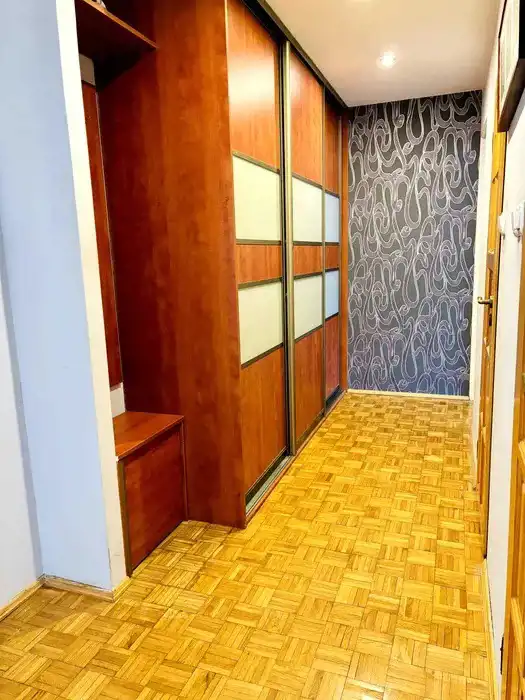 W mieszkaniu są okna PCV, na podłogach w pokojach mozaika, w kuchni i łazience kafle, w przedpokoju duża szafa w zabudowie.