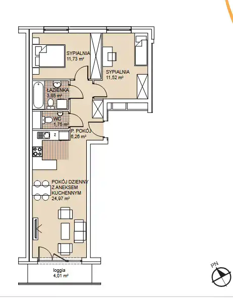 Funkcjonalne mieszkanie trzypokojowe o powierzchni 6o m2 usytuowane na czwartym piętrze apartamentowca.