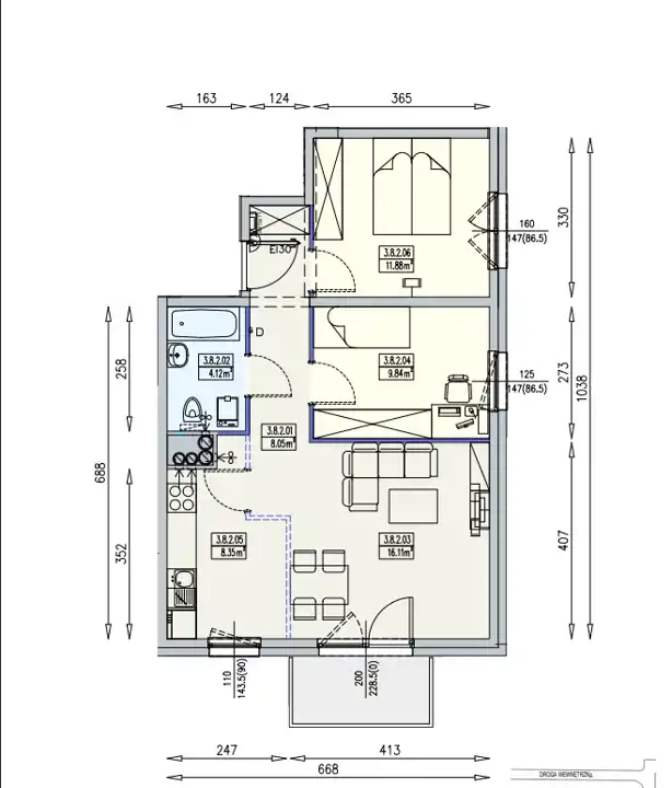 - Charakterystyka mieszkania 58.4 m2, 3 pokoje