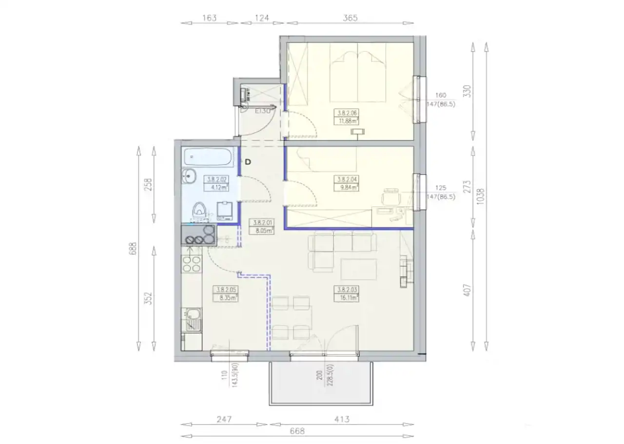 - Charakterystyka mieszkania 58.38 m2, 3 pokoje