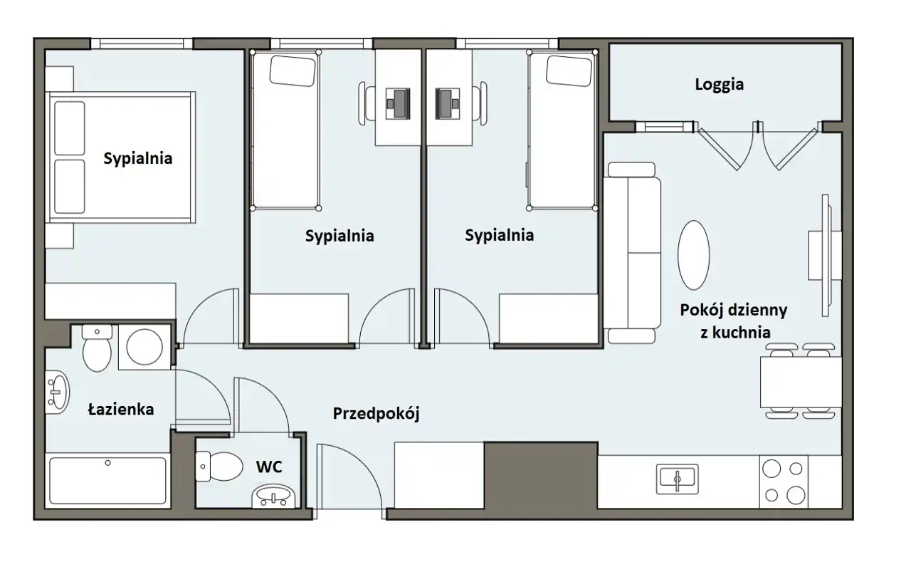 - trzy ustawne sypialnie