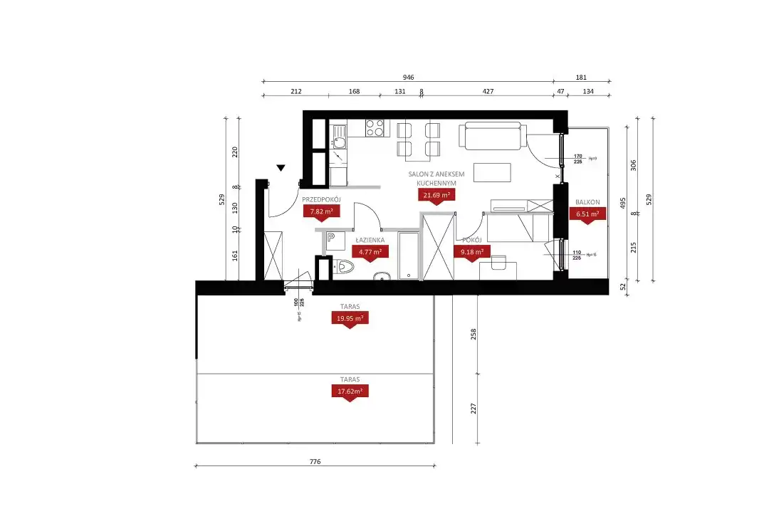 - Charakterystyka mieszkania 44 m2, 2 pokoje