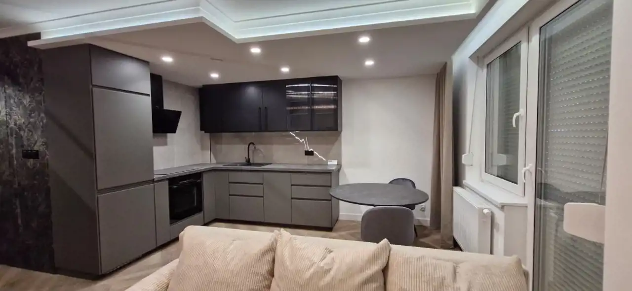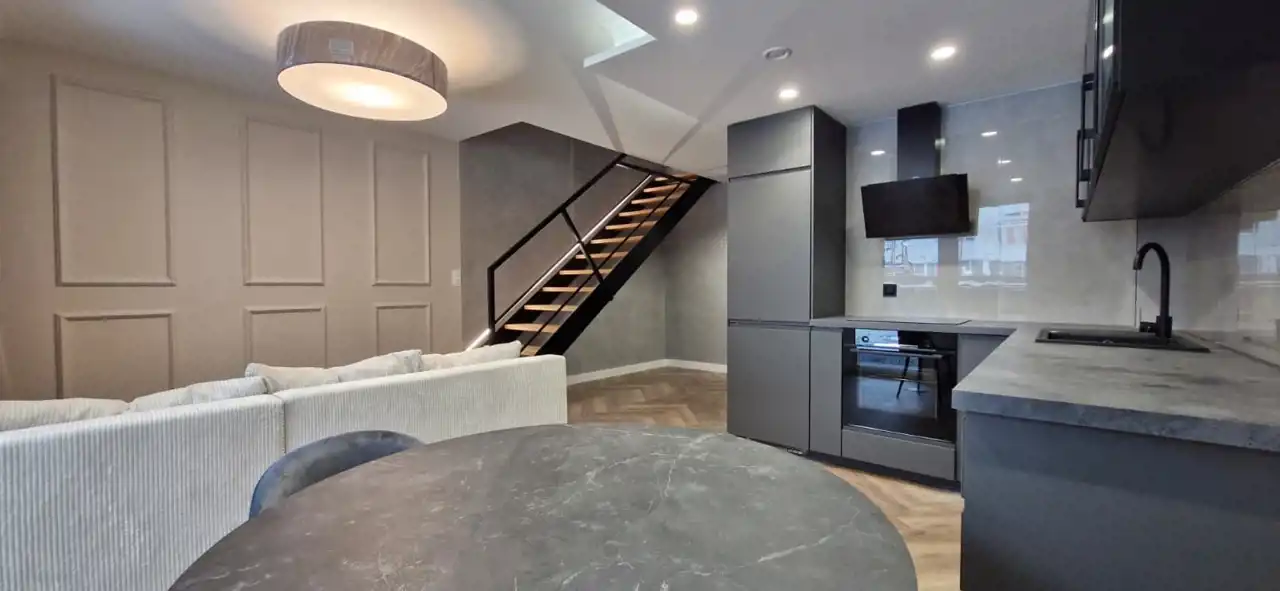Nowoczesna kuchnia z pełnym wyposażeniem AGD: zmywarka, lodówka, piekarnik, płyta indukcyjna