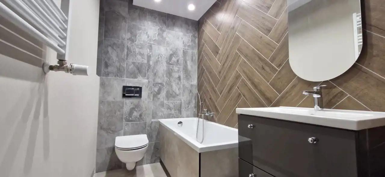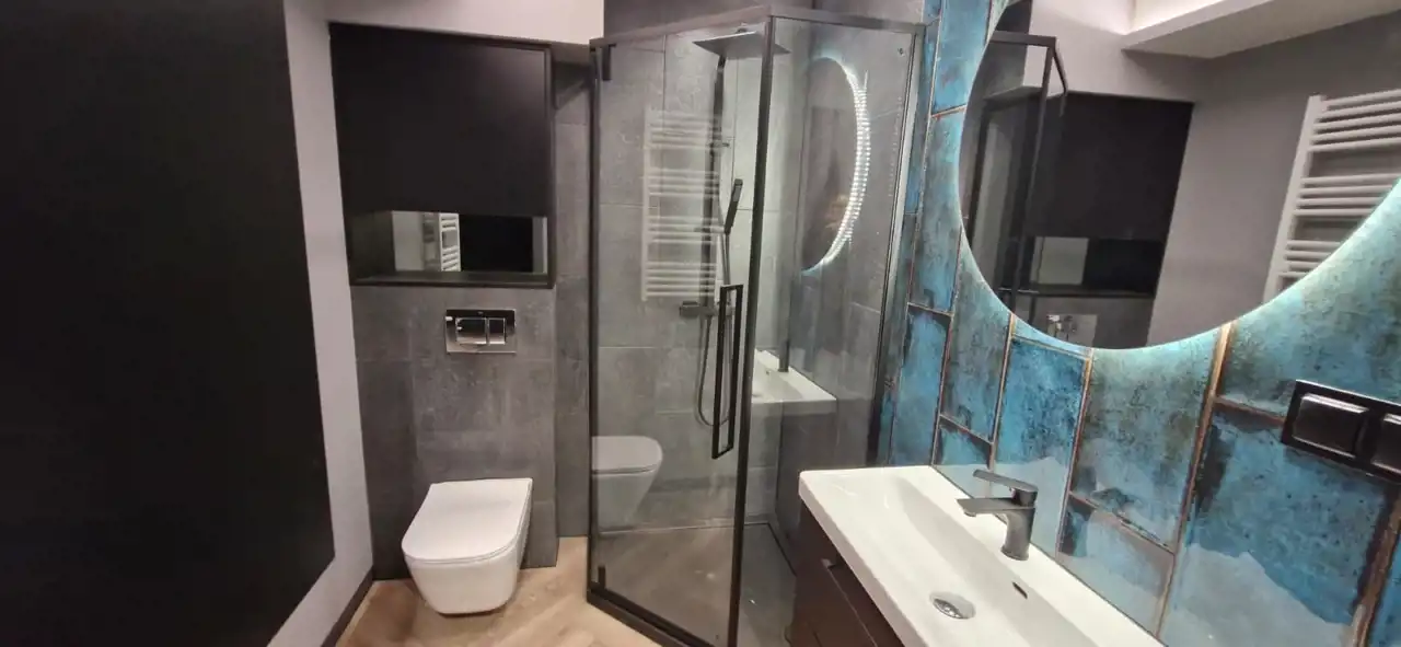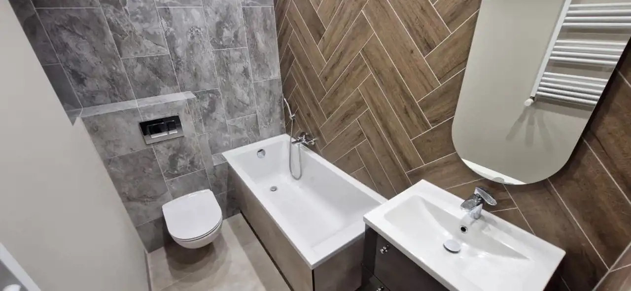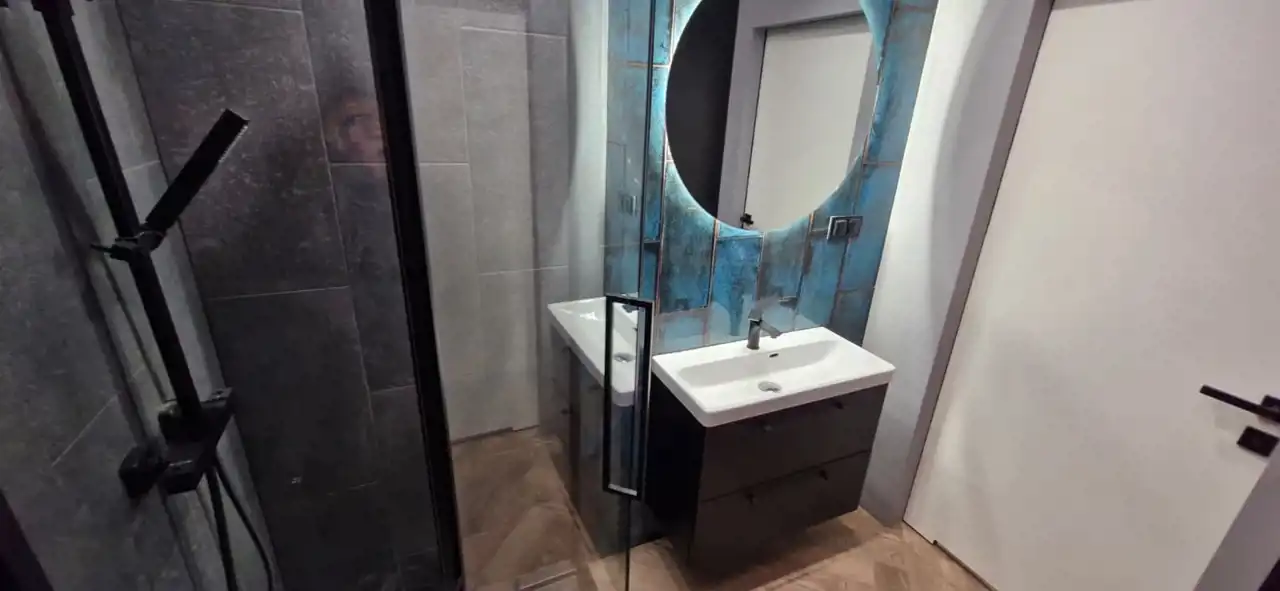 Dwie łazienki: dolna z kabiną prysznicową, górna z wanną i WC