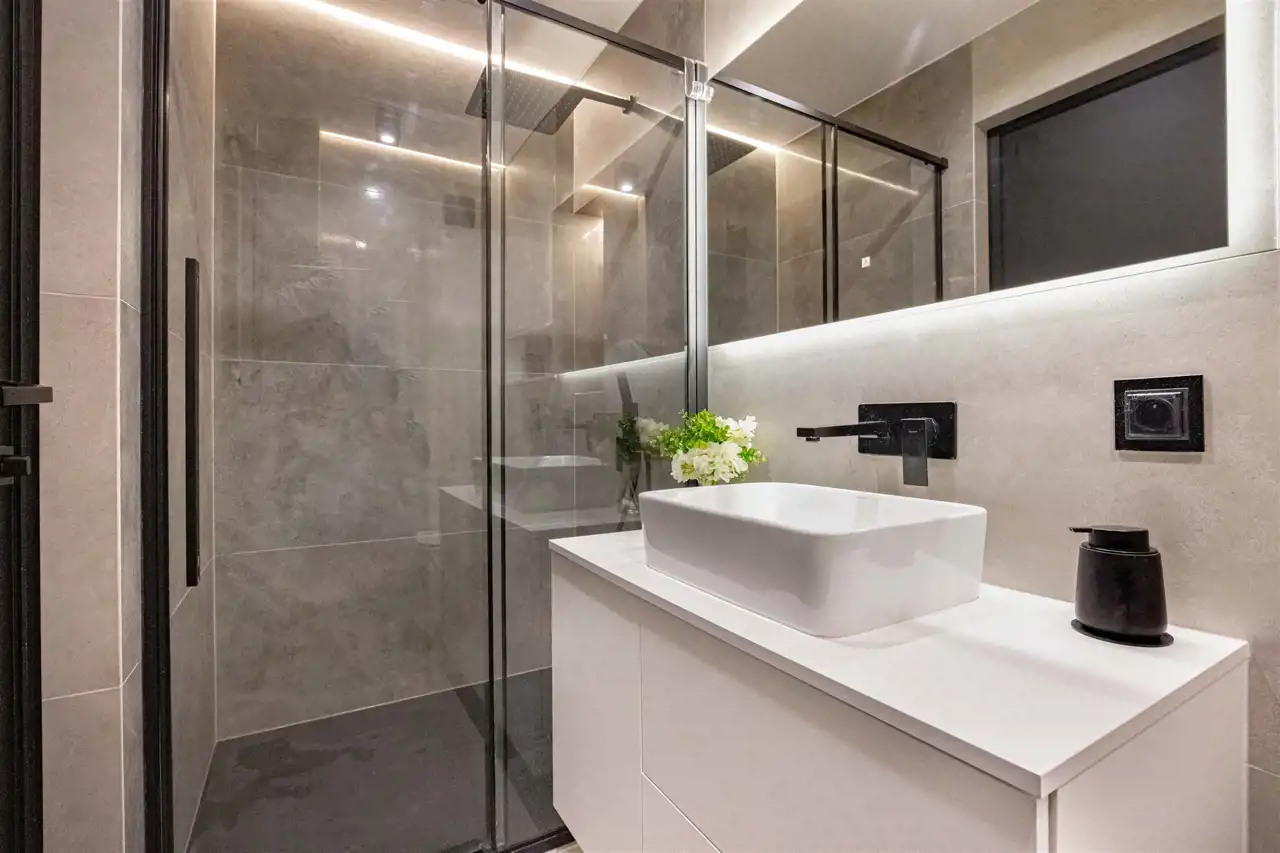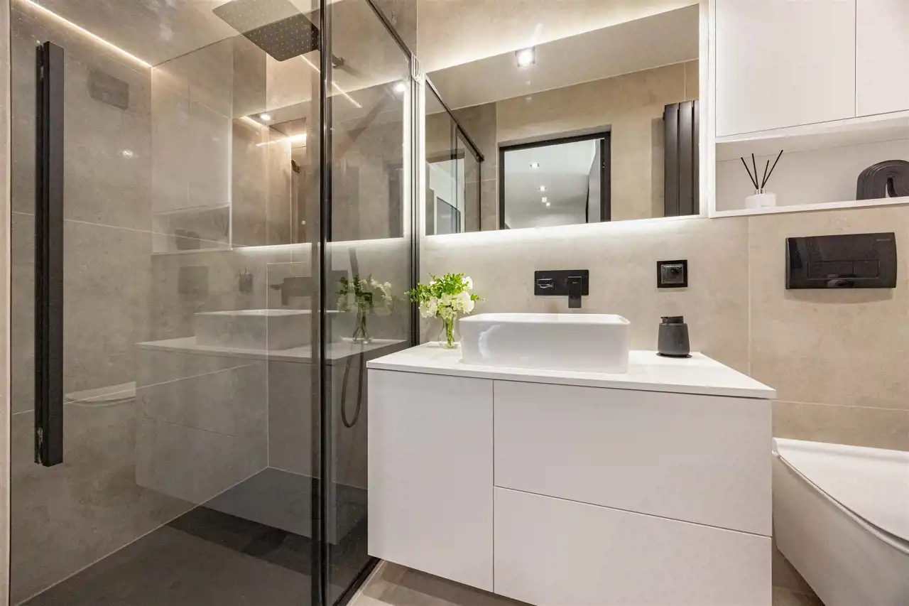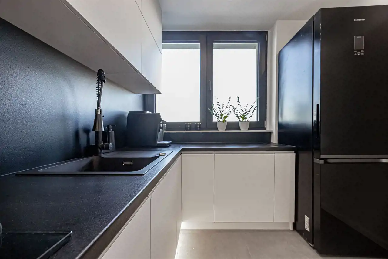 Nowoczesne wykończenie premium – m.in. hiszpańskie płytki, trzyszybowe okna, matowe fronty, betonowe parapety