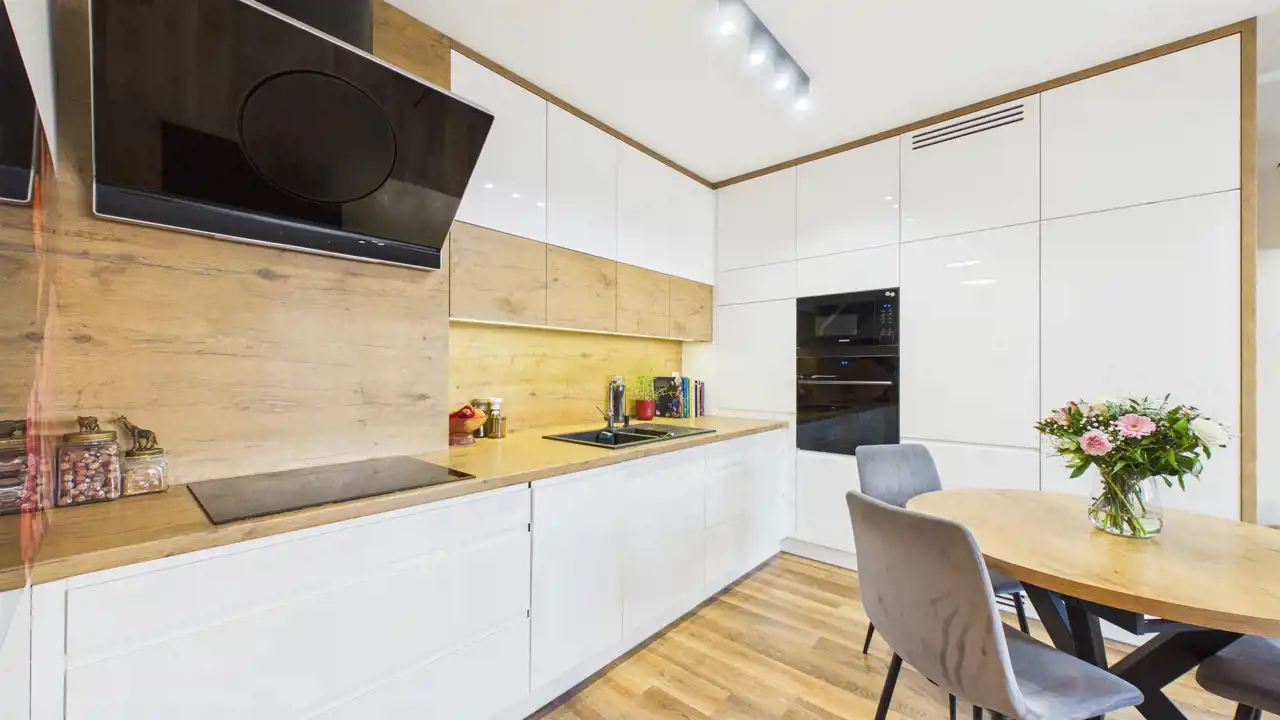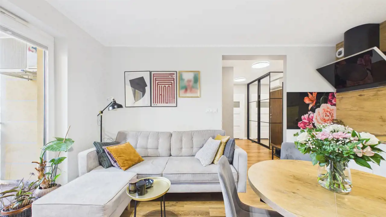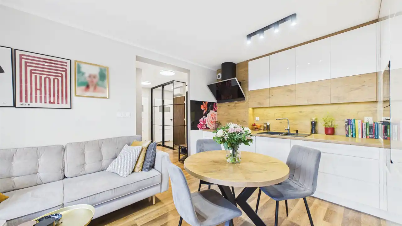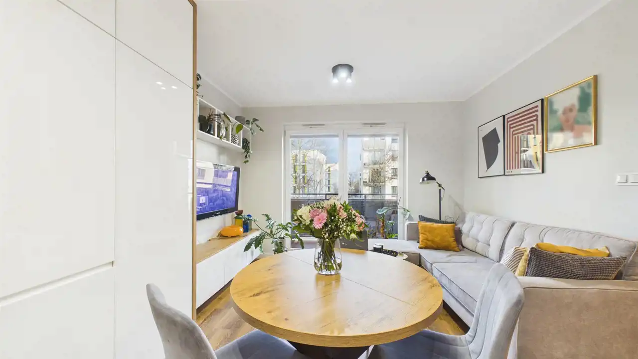 jasny salon z częścią jadalnianą oraz wyjściem na balkon,
