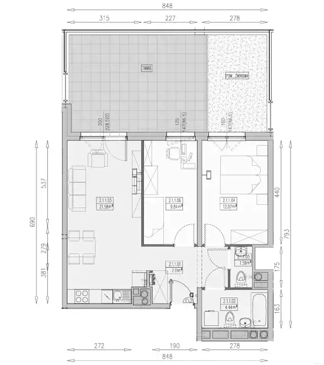 - Charakterystyka mieszkania 57.7 m2, 3 pokoje